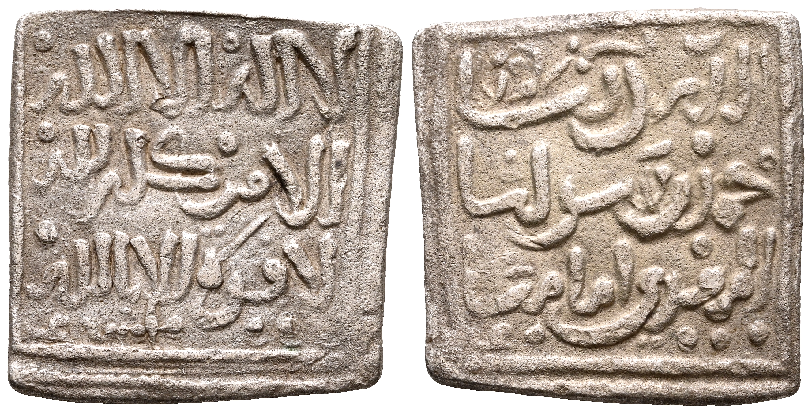ALMOHADES. Anónimo a nombre del imán Al-Mahdi. Dirham, copia africana de época. (Ar. 1,31g/13mm). Fez / فاس. (Vives tipo 2107; Hohertz tipo 601b). MBC. Interesante variante. Singularmente, además de los típicos roeles, esta pieza contiene en la esqui na inferior izquierda de ambas áreas, un diminuto adorno en forma de ''ʿayn'' inicial y que posiblemente se trate de una marca de conteo.