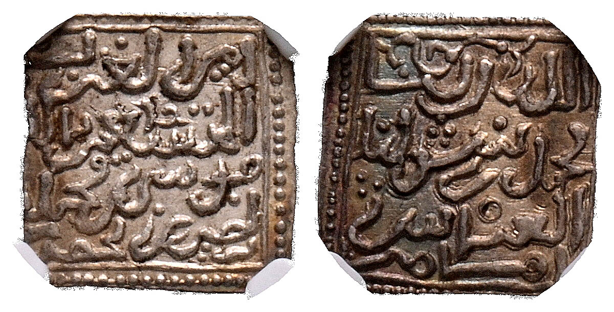 TAIFAS ALMOHADES, ALGARVE. Musa ibn Muhammad. Dirham. (Ae. 1,52g/14mm). 631-660H. (Vives 2123var; Album 4275; Hohertz 657f, catalogado como RRR). Anv: اللّٰه ربنا (Dios es nuestro Señor) / محمد رسولنا (Muhammad nuestro mensajero) / العباسى (el Abbasi ) / امامنا (nuestro imán). Rev: امير الغرب (Emir del Algarve) / المستعين بالله (al-musta`in bi-llah) / موسى بن محمد (Musa, hijo de Muhammad) / بن نصير بن محفوظ (hijo de nasr, hijo de Mahfuz). Encapsulado por NGC MS 61. Muy raro ejemplar. Aunque el t ítulo utilizado por este gobernante, امير الغرب / Emir del Algarve, nos remite indiscutiblemente al sur de Portugal, su traducción literal es «Emir del Oeste», en relación con la posición geográfica que ocupaba esta taifa sublevada. Actualmente se co nsidera que este reino comprendía Niebla (Labla), donde se ubicaría su ceca, cerca de la actual ciudad de Huelva, Saltés, así como parte del Algarve, en Portugal.