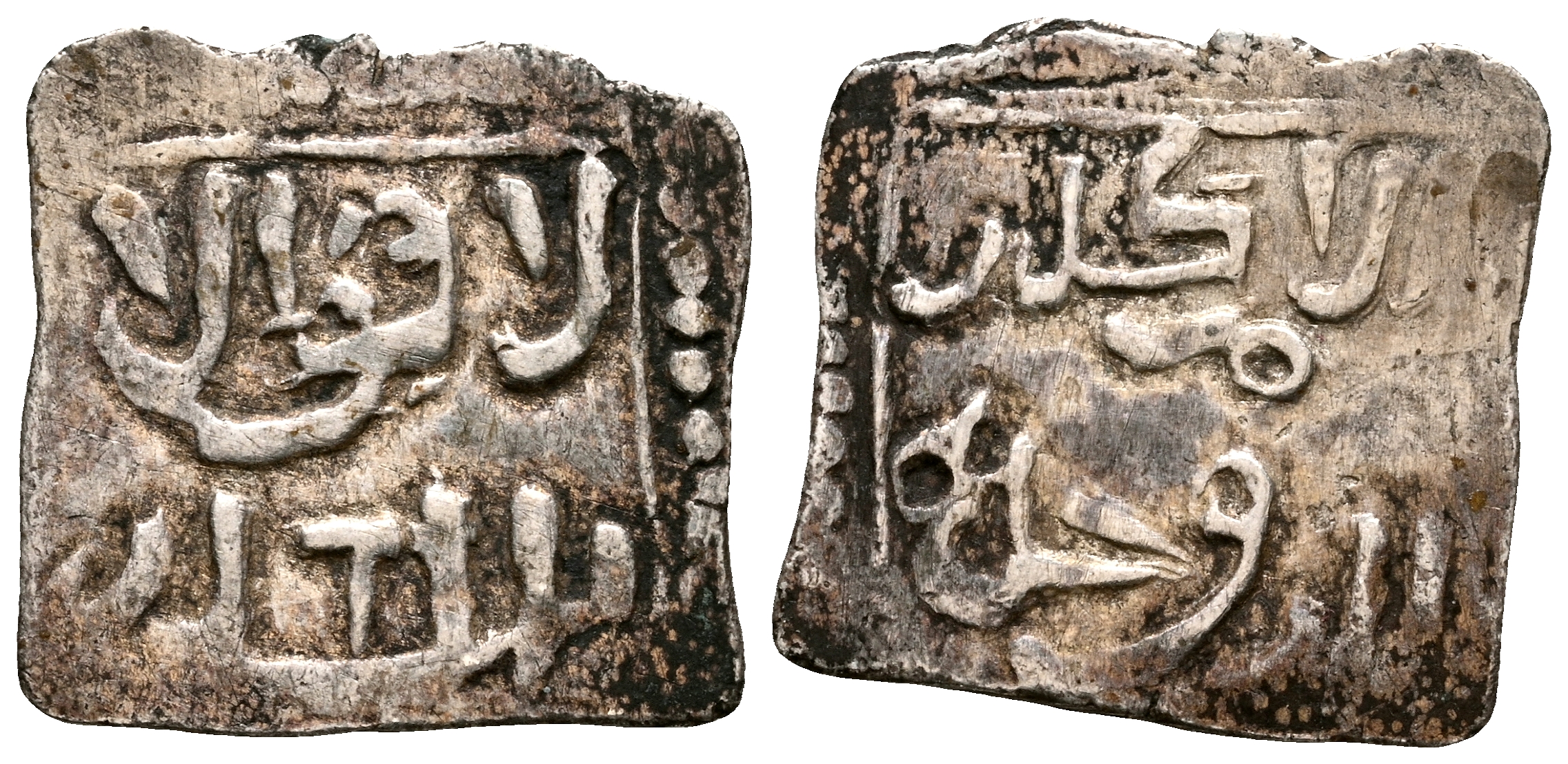 MERINÍES. Anónima. 1/3 Dirham. (Ar. 0,43g/11mm). Sin ceca. (Hohertz 853). Anv: لا قوة الا / بالله. Rev: الأمر كله / لله وحده. MBC-. Raro ejemplar.