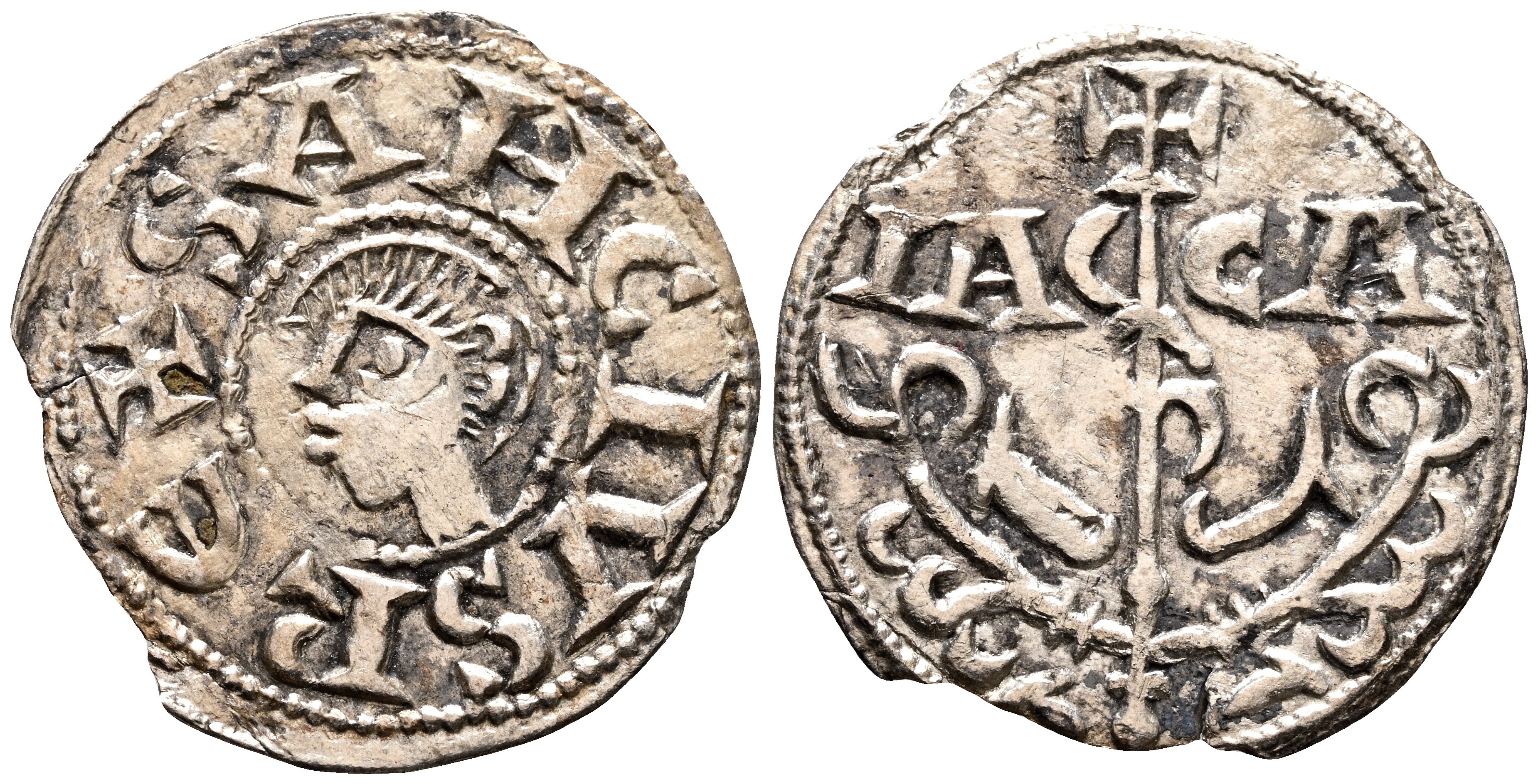 SANCHO RAMIREZ (1063-1094). Dinero. (Ve. 0,97g/20mm). Jaca. (Cru. V.S. 207). Anv: Cabeza a izquierda dentro de gráfila de puntos, alrededor leyenda: SANCIVS REX. Rev: Arbol superado por cruz, a ambos lados leyenda: IAC-CA. EBC-. Rarísimo ejemplar, tenemos constancia de otros dos ejemplares, uno de ellos vendido por Aureo & Calicó, Subasta Selección de 2008 (13/03/2008), Nº Lote 93, adjudicado por 6.000€ más su respectiva comisión, el otro fue vendido por Jesús Vico, Subasta selección de las monedas de la colección Archer M. Huntington (Ex Hispanic Society of America) (09/10/2012), Nº Lote 784, adjudicado por 4.800€ más su respectiva comisión.