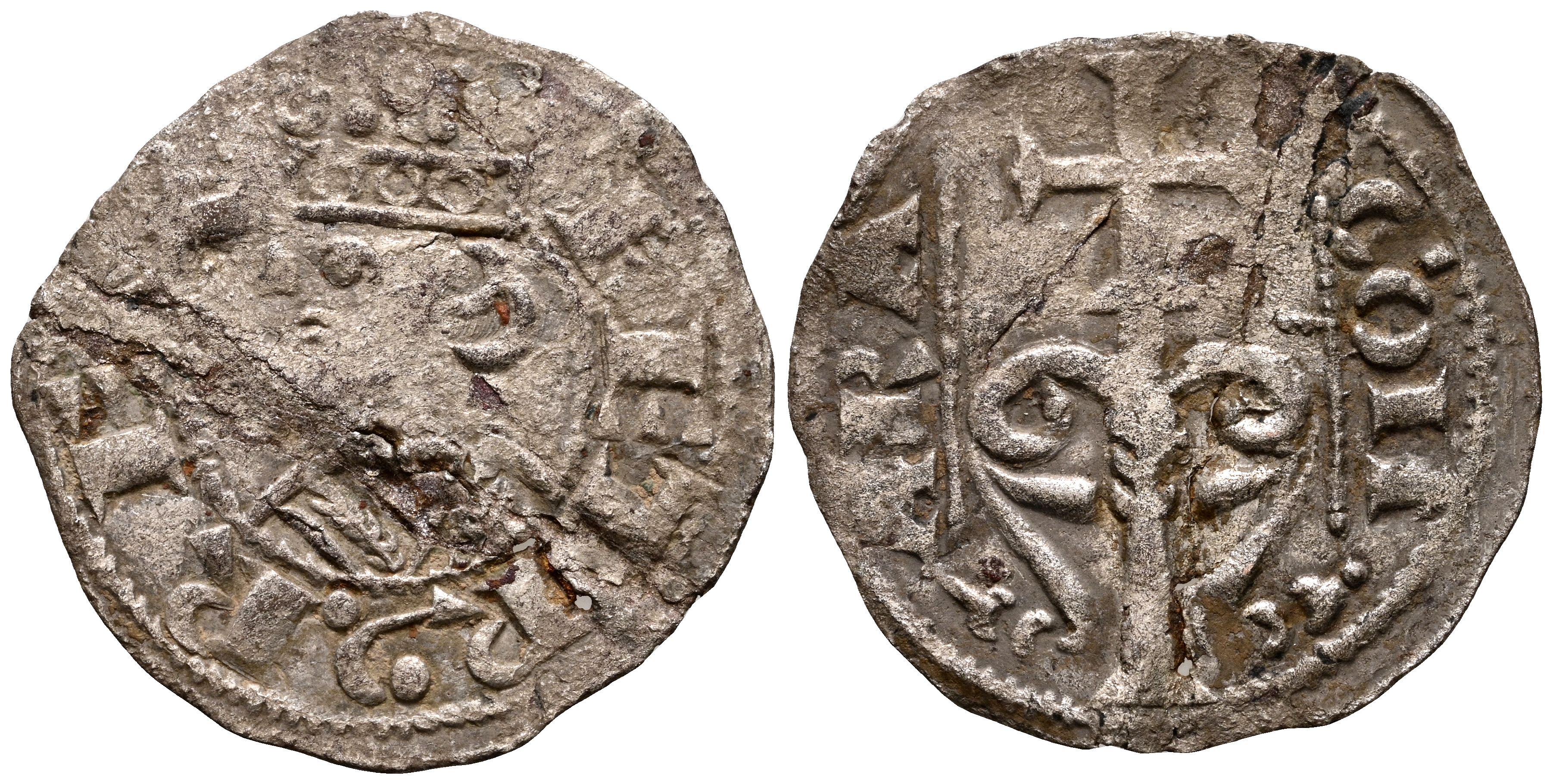 PEDRO II (1196-1213). Dinero. (Ve. 0,67g/19mm). Aragón. (Cru.V.S. 302). Anv: Busto coronado de Pedro II a izquierda, alrdedor leyenda: PETR REX. Rev: Cruz sobre árbol, alrededor leyenda: ARAGON. MBC-.