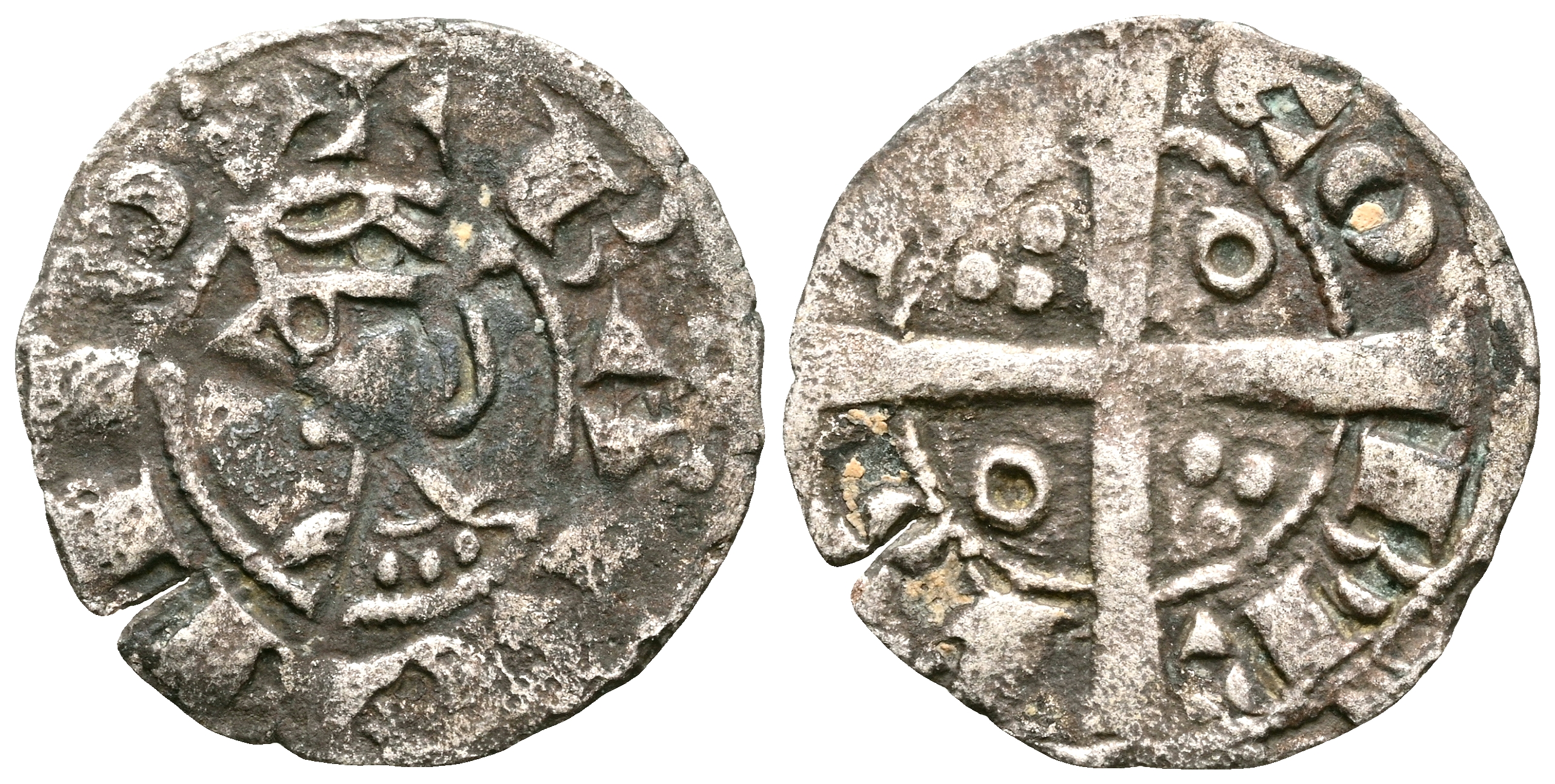 JAIME I (1213-1276). Obolo. (Ve. 0,33g /13mm). Barcelona. (Cru. V.S. 309). Anv: Busto coronado de Jaime I a la izquierda, alrededor de la leyenda: BARQVINO. Rev: Cruz cortando gráfila, tres puntos en primer y cuarto cuadrante y roeles en segundo y tercer cuadrante, alrededor de la leyenda: IACOB REX. MBC. Escaso.