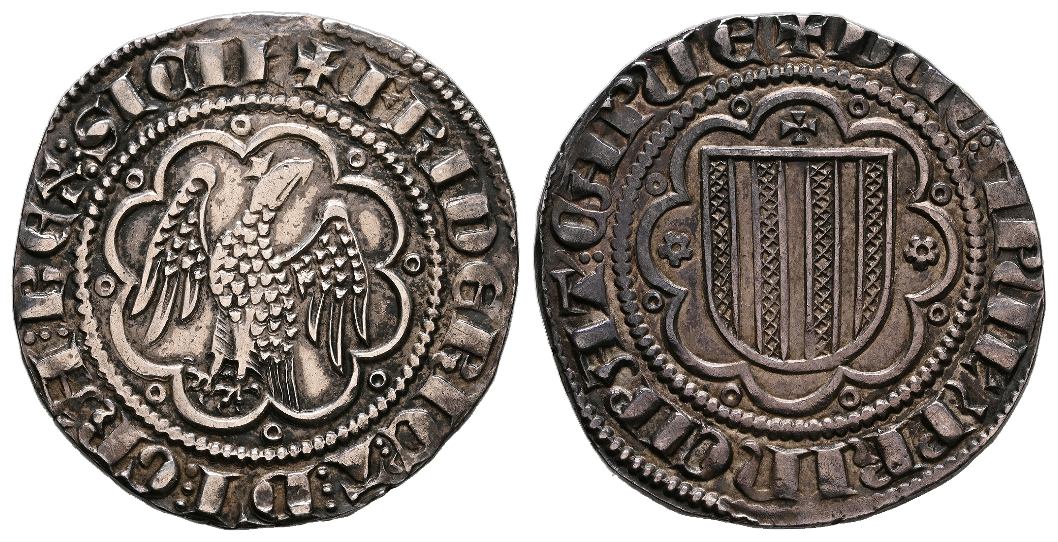 FEDERICO III de Sicilia. (1296-1337). Pirral. (Ar. 3,32g/23mm). Messina, corona de Aragón. (Cru. V.S. 566). Anv: Aguila coronada con las alas abiertas estante a izquierda mirando a derecha, dentro de gráfila lobular, alrededor leyenda: FRIEDERIC T DI GRA REX SICIL. Rev: Escudo de armas catalán, entre dos rosas, encima cruz, todo dentro de gráfila lobular, alrededor leyenda: DUC APVL PRINCIPAT CAPUE. EBC-. Muy bonito ejemplar con esta atractiva pátina.