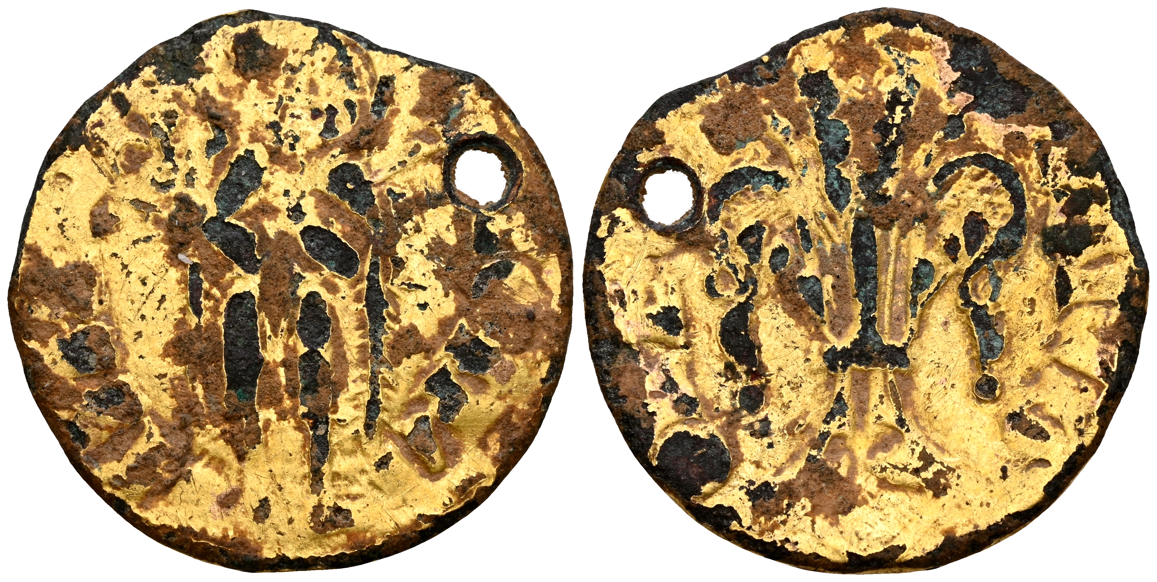 CORONA DE ARAGÓN. Florín forrado. (Au-Ae. 2,04g/19mm). ¿Valencia?. Anv: San Juan estante de frente portando cetro, alrededor leyenda: ¿IOHANNES B? Rev: Flor de lis, alrededor leyenda: ¿ARAGO REX? MBC-. Perforación.