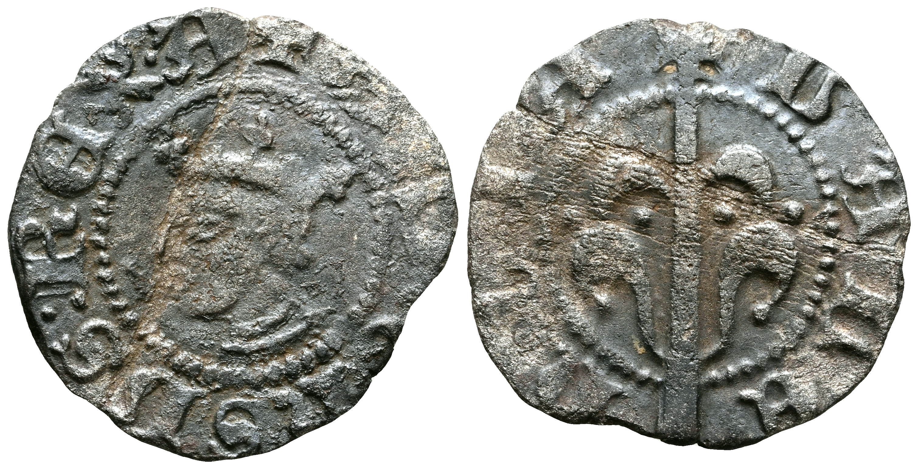 ALFONSO IV (1416-1458). Dinero. (Ve. 0,70g/16mm). Valencia. (Cru.V.S. 866). Anv: Busto coronado de Alfonso V a izquierda, alrededor leyenda: ALFONSVS REX. Rev: Arbol, sin marcas, alrededor leyenda: VALENCIA. MBC-.