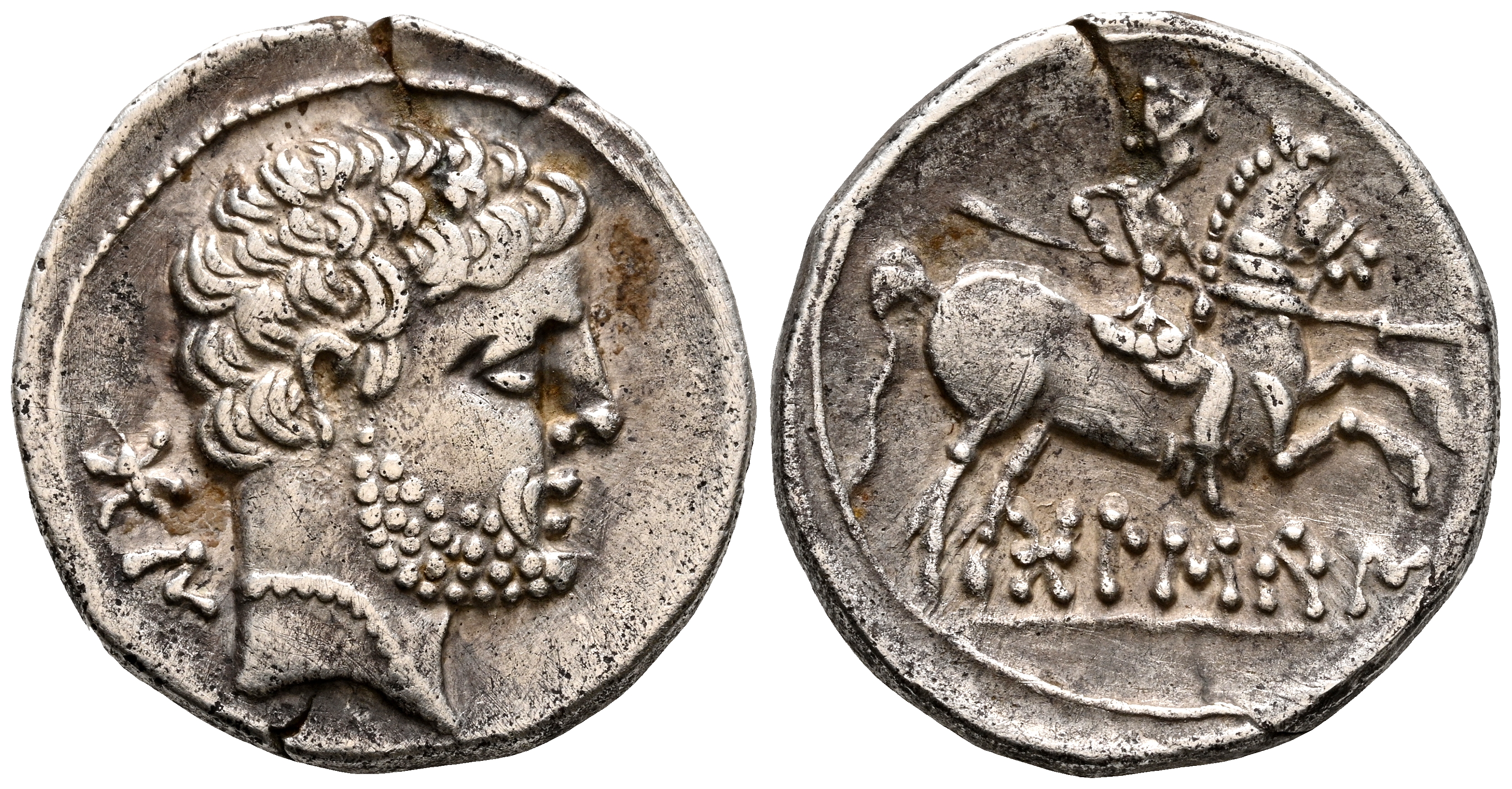 BOLSCAN (Huesca). Denario. (Ar. 4,04g/17mm). 180-20 d.C. (FAB-1911). Anv: Cabeza masculina barbada a derecha, detrás letras ibéricas: BoN. Rev: Jinete con lanza a derecha, bajo leyenda ibérica: BoLSCaN. MBC. Grietas.