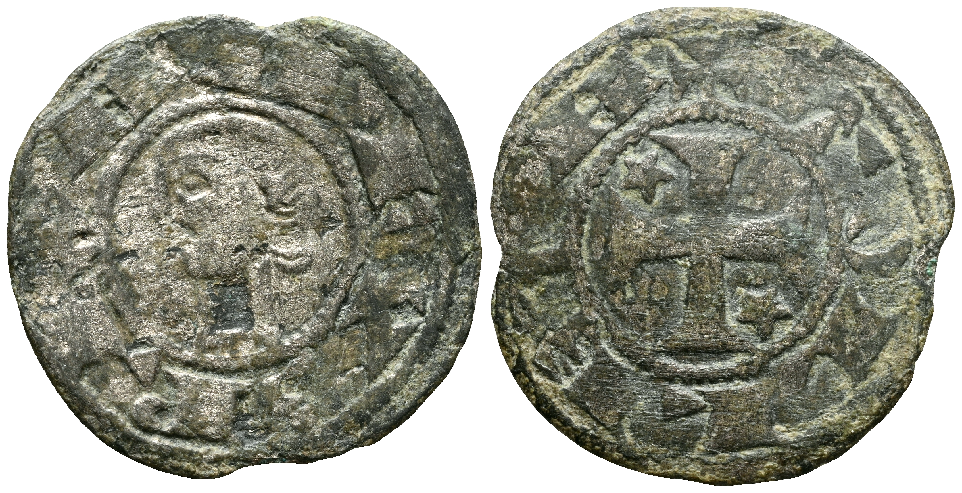 ALFONSO VIII (1158-1214). Dinero. (Ve. 0,79g/18mm). Taller itinerante de batalla. (Imperatrix A8:28.2; FAB-23, como Alfonso I de Aragón). Anv: Cabeza desnuda de Alfonso VIII a izquierda dentro de gráfilar circular, alrededor leyenda: ANFVS REX. Rev: Cruz patada con estrella y con punto central en 1º y 4º cuadrante, todo dentro de gráfila circular, alrededor leyenda: TOLLETA. MBC. Alabeada.