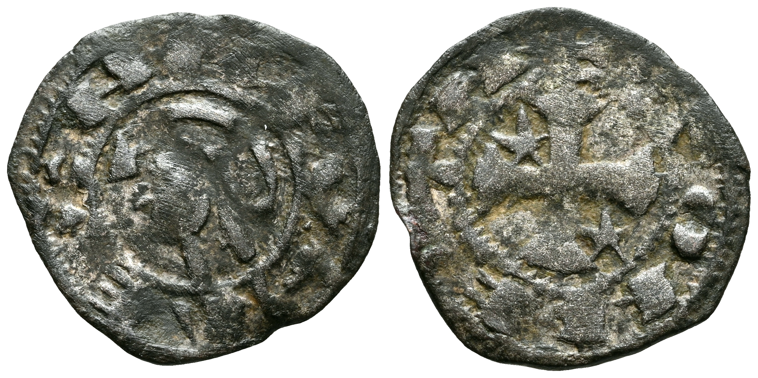 ALFONSO VIII (1158-1214). Meaja / Óbolo. (Ve. 0,40g/13mm). Toledo. (Imperatrix A8; FAB-24 como Alfonso I de Aragón). Anv: Busto a izquierda dentro de gráfilar circular, alrededor leyenda: ANFVS REX. Rev: Cruz patada con estrella en primer y cuarto cuadrante, todo dentro de una gráfila circular, alrededor leyenda: TOLLETA. MBC.