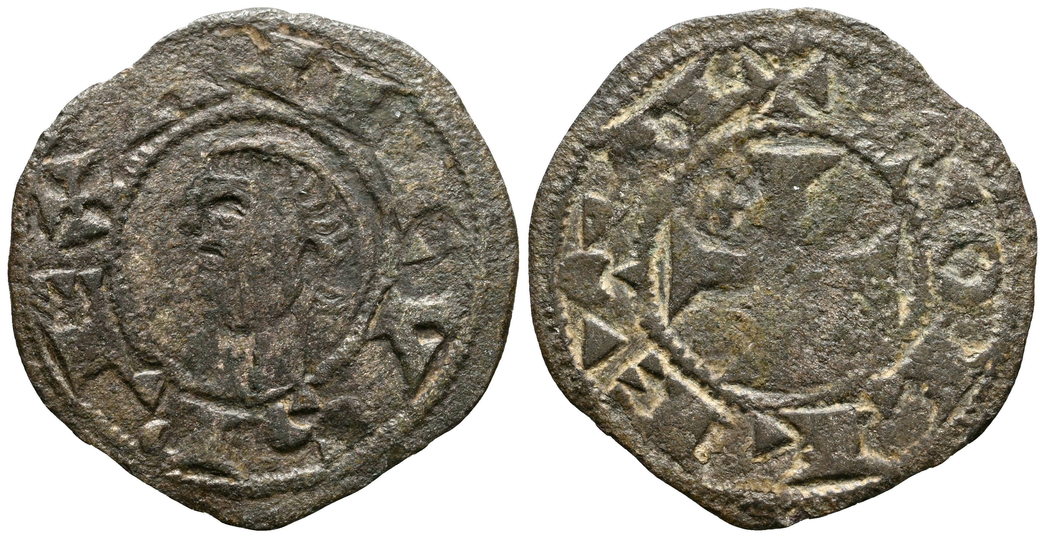 ALFONSO VIII (1158-1214). Dinero. (Ve. 0,90g/17mm). Toledo. (Imperatrix A8; FAB-25.3 como Alfonso I de Aragón). Anv: Busto a izquierda dentro de gráfilar circular, alrededor leyenda: ANFVS REX. Rev: Cruz patada con estrella en primer y cuarto cuadrante, todo dentro de una gráfila circular, alrededor leyenda: TOLLETA. MBC.