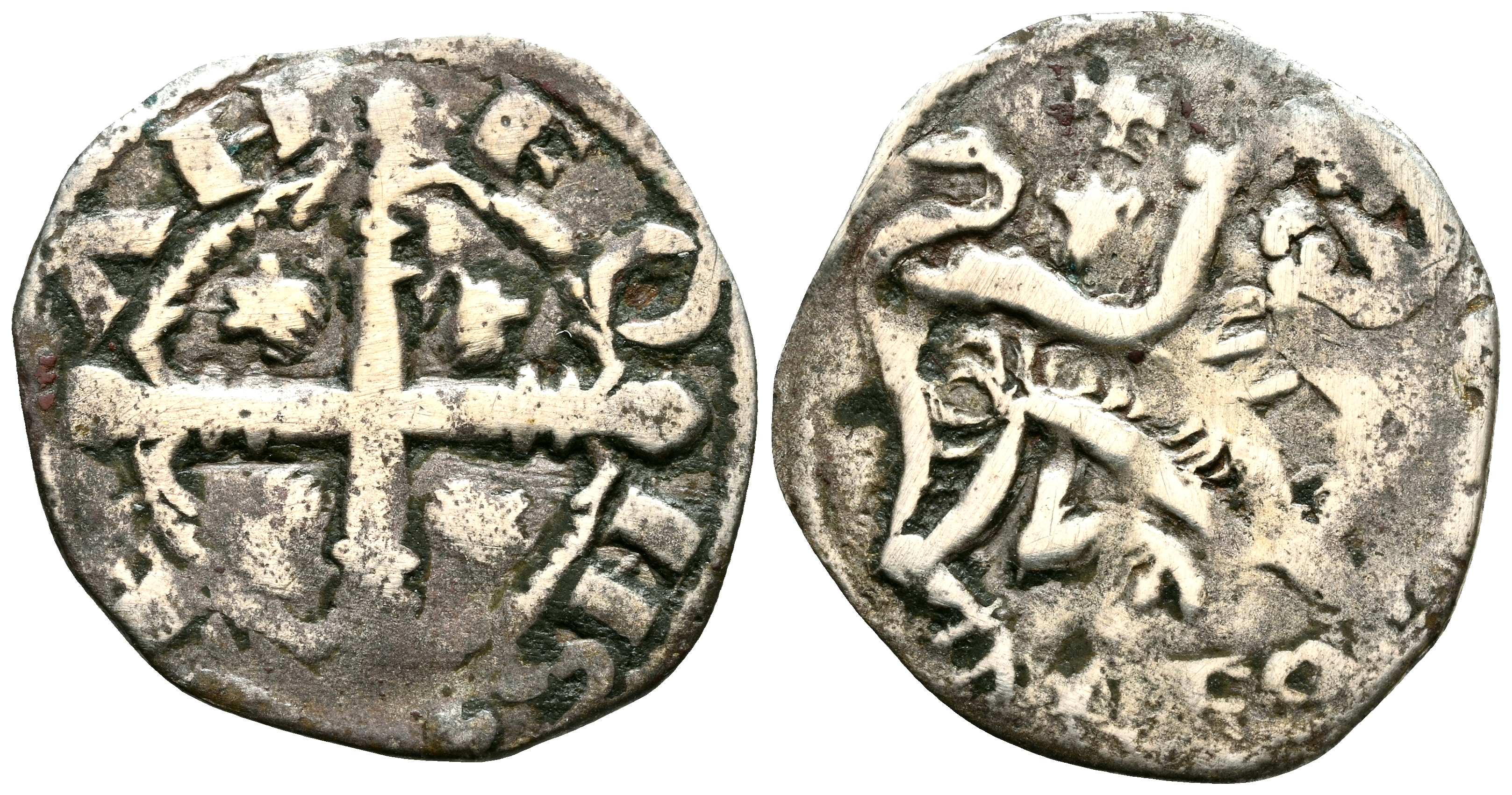 ALFONSO IX (1188-1230). Dinero. (Ve. 0,81g/17mm). Coruña. (FAB-131.1). Anv: Cruz floreada y veneras en los cuarteles, alrededor leyenda: ALFONS REX. Rev: León a derecha, encima cruz potenzada y venera, debajo: LEO. MBC.