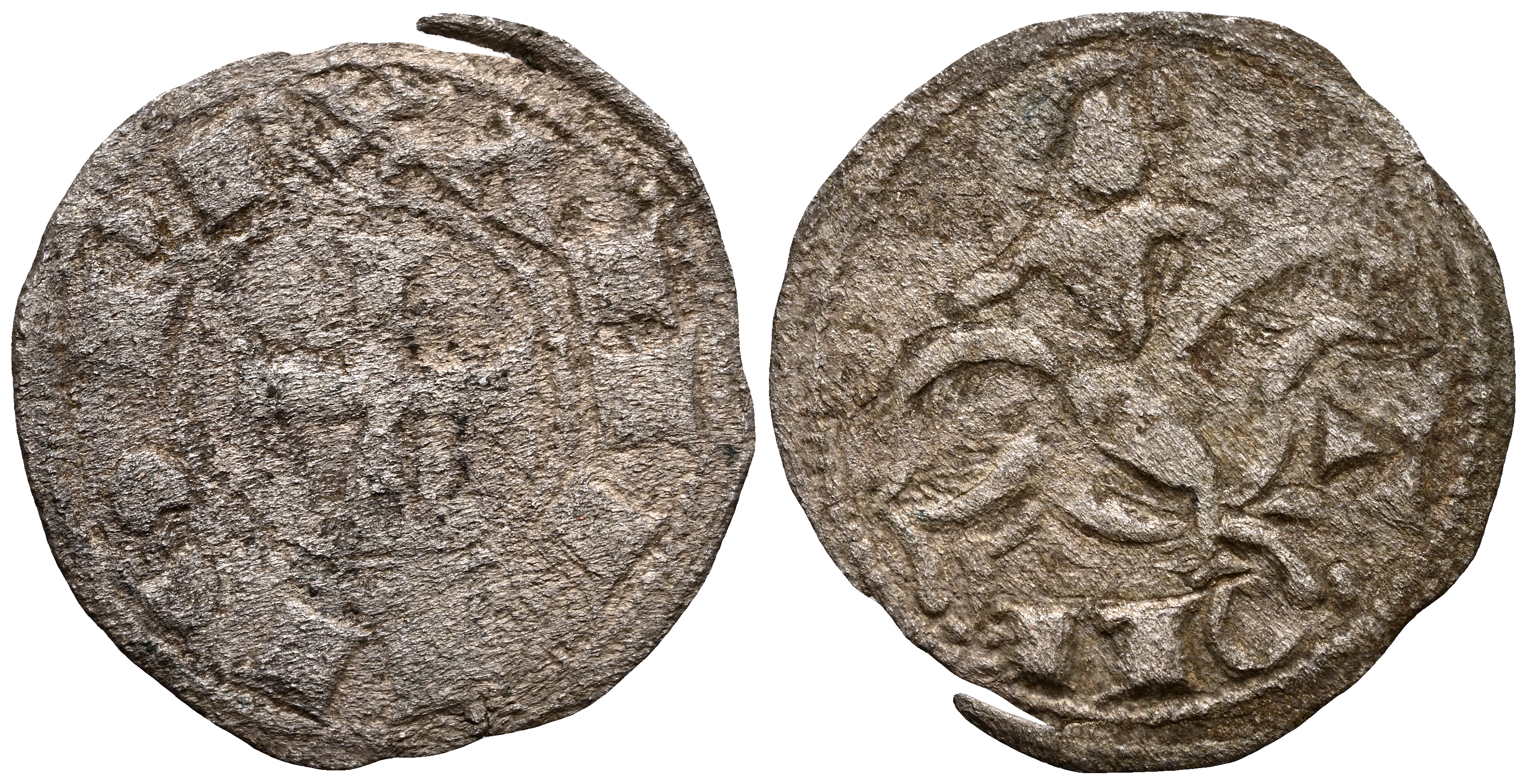 ALFONSO VIII (1158-1214). Dinero. (Ve. 0,60g/17mm). Posiblemente Toledo. (MMM A8:38.27; FAB-179). Anv: Cruz patada con creciente en 3º cuadrante, alrededor leyenda: ANFVS REX. Rev: Jinete a derecha con palma, entre las patas leyenda: TOLE. MBC-. Muy raro ejemplar.