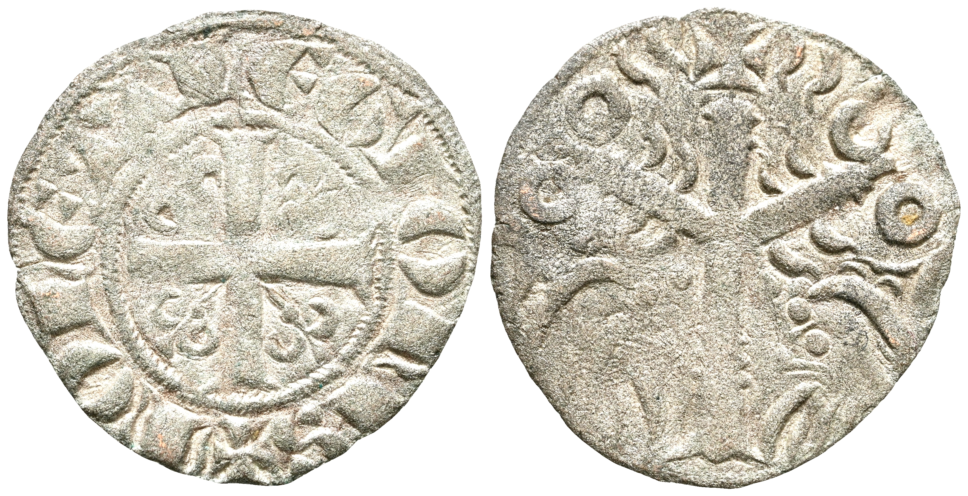 SANCHO IV (1282-1284). Dinero "Salamanques". (Ve. 0,48g/17mm). León. (MMM S4:2.6; FAB-212, como Fernado III). Anv: Cruz potenzada con cuatro flores de lis unidas al centro por un vástago dentro de gráfila de puntos, alrededor leyenda: MONETA LEGIONIS. Rev: Dos leones lineales y punteados bajo árbol del Paraíso de aspecto espinado con base plana remata de cruz, a ambos los lados de la cruz crecientes dobles internos alargados. MBC+.