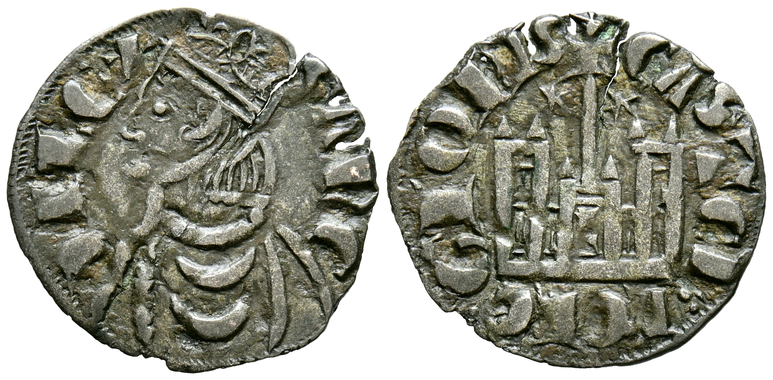 SANCHO IV (1284-1295). Cornado. (Ve. 0,64g/18mm). León. (Imperatrix S4:3.24; FAB-299.4). Anv: Busto coronado a izquierda, alrededor leyenda: SANCII REX. Rev: Castillo con cruz sobre vástago central con estrellas a los lados y L en la puerta, alrededor leyenda: CASTELLE E LEGIONIS. MBC+.