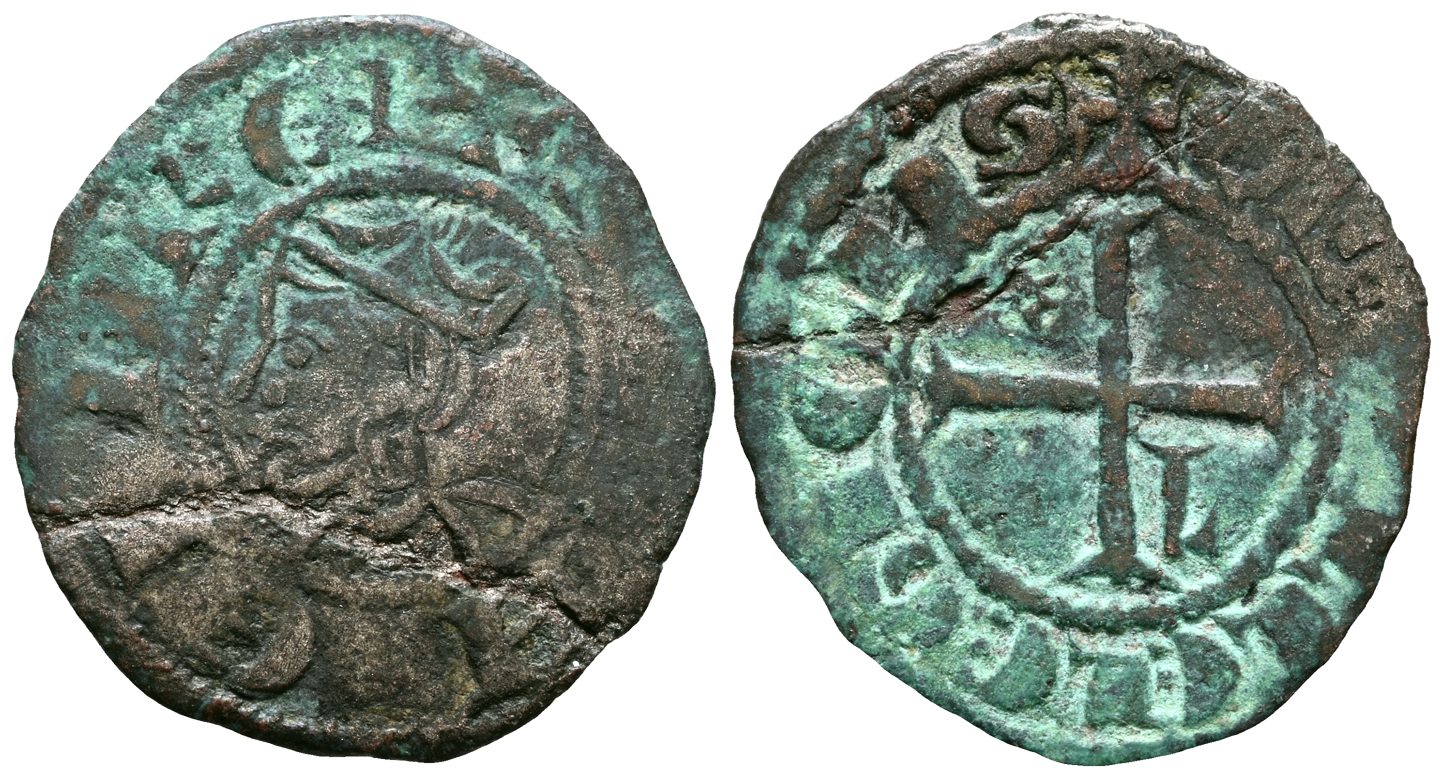 SANCHO IV (1284-1295). Meaja Coronada. (Ve. 0,58g/16mm). León. (Momeca 43.2A5.1; FAB-311, como seisén). Anv: Busto coronado de Sancho IV a izquierda, alrededor leyenda: SANCII REX. Rev: Cruz patada con estrella en primer cuadrante y L en el cuarto cuadrante, alrededor leyenda: CASTELLE LEGIONIS. MBC.