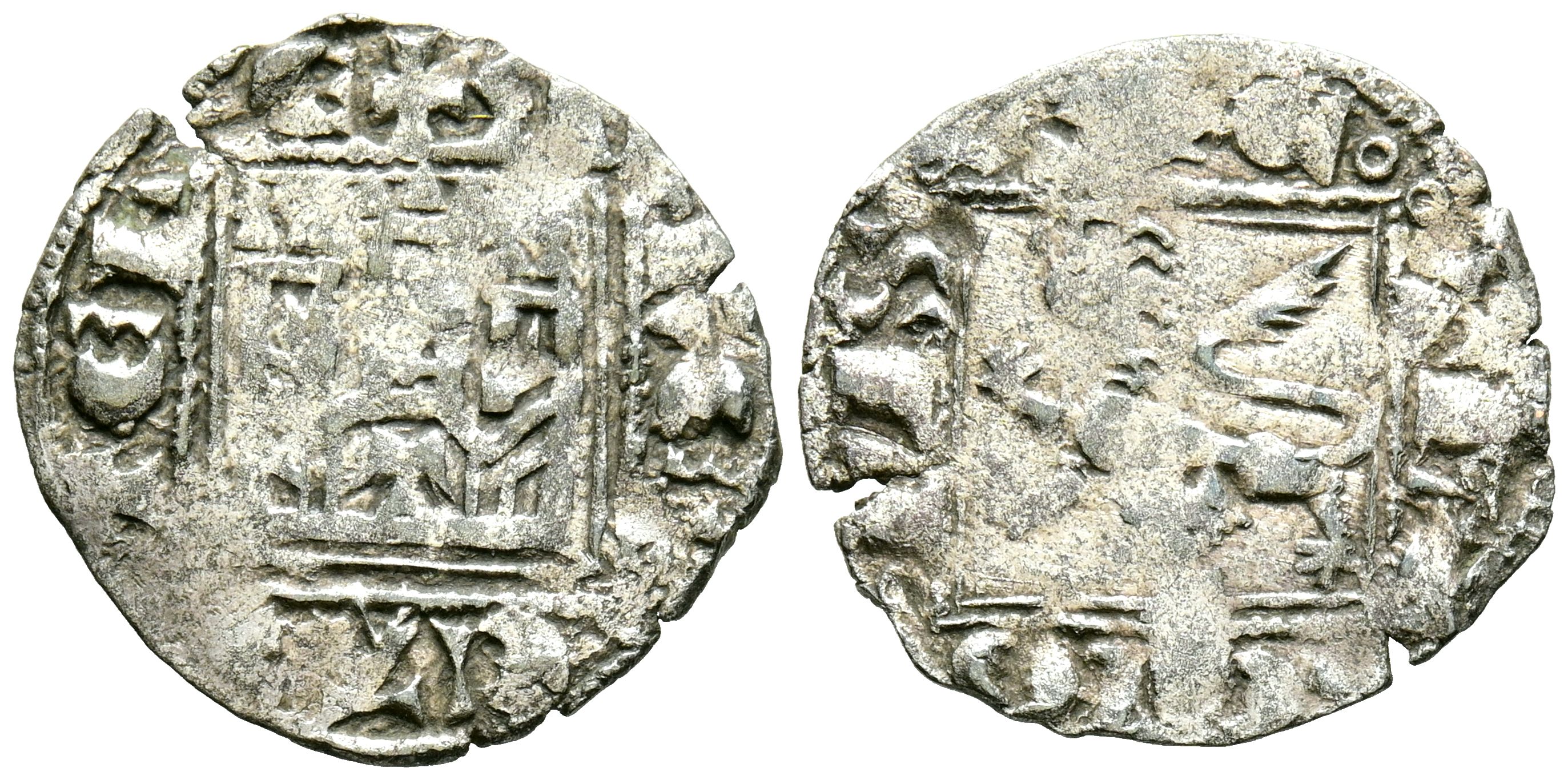 ALFONSO XI (1312-1350). Dinero Novén. (Ve. 0,94g/19mm). Toledo. (Imperatrix A11:1.35; FAB-359.1). Anv: Castillo con T en la puerta, todo dentro de gráfila cuadrada, alrededor leyenda: ALF REX CASTELLE. Rev: León rampante a izquierda, delante rodela, alrededor leyenda: ET LEGIONIS. MBC.