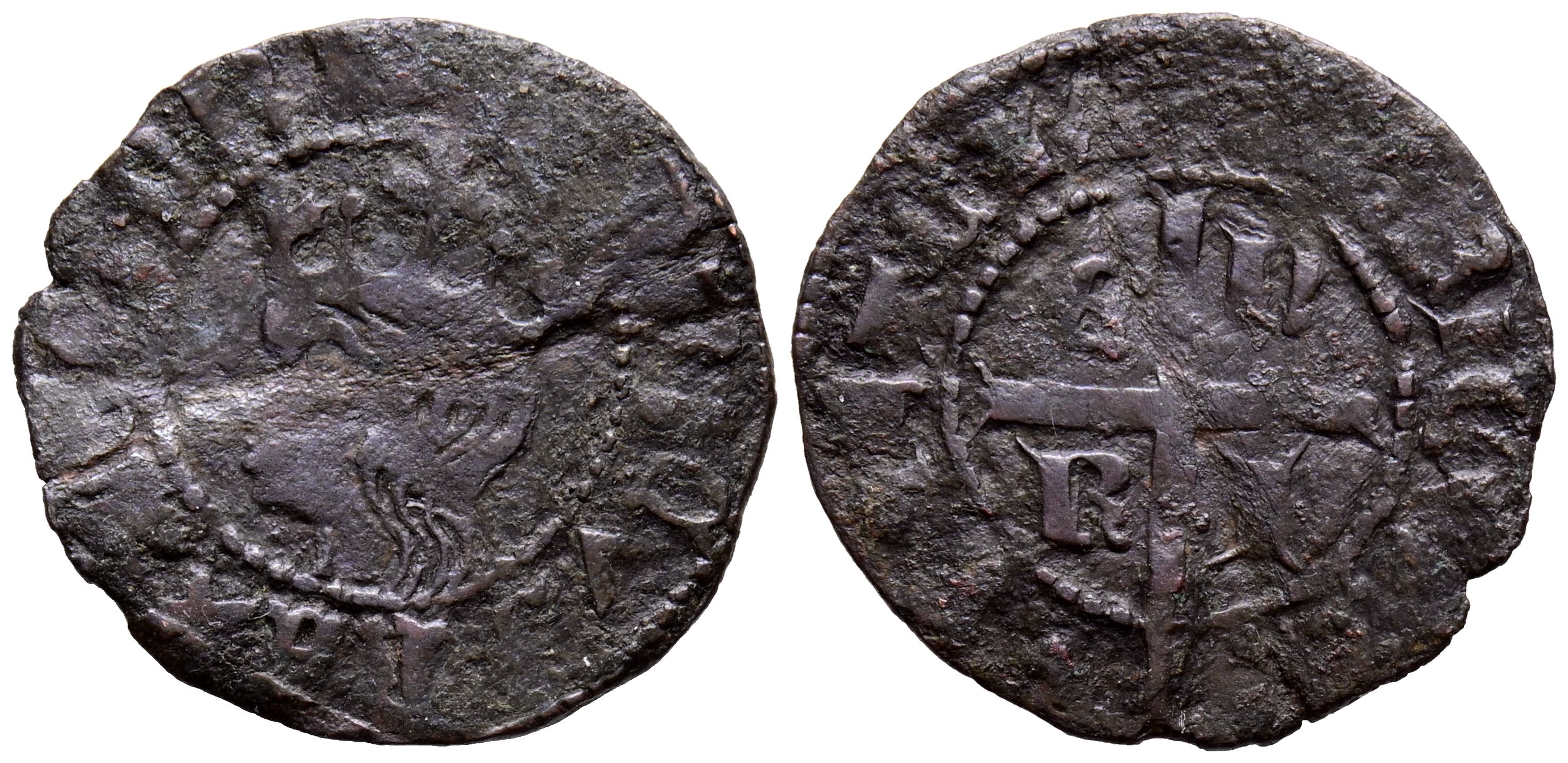 ENRIQUE II (1368-1379). Cruzado. (Ve. 1,29g/20mm). Sin marca de ceca. (Imperatrix E2:11.99; FAB-450). Anv: Cabeza coronada de Enrique II a izquierda dentro de gráfila circular, alrededor leyenda: ENRICVS REX LEGIONIS. Rev: Cruz latina, en los cuarteles E-N-R-I, alrededor leyenda: ENRICVS REX CASTELLE. MBC-. Doblez central.