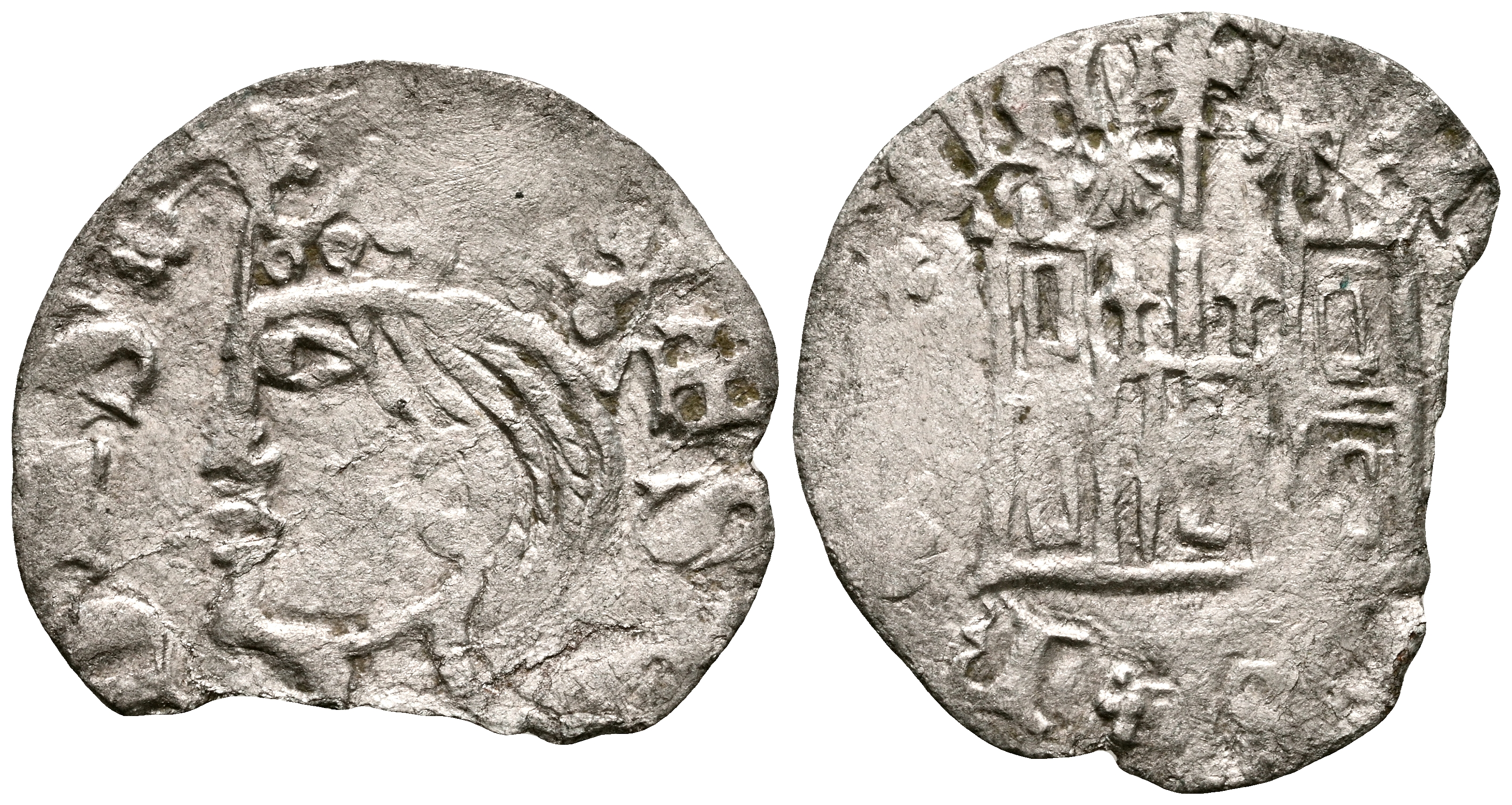ENRIQUE II (1368-1379). Cornado. (Ve. 0,48g/17mm). Coruña. (Momeca 60.1E.1; FAB-482). Anv: Busto coronado de Enrique II a izquierda dentro de semigráfila, a los lados leyenda: SI DNS. Rev: Castillo con cruz sobre vástago central entre veneras, alrededor leyenda: ENRICVS REX C. MBC-. Vanos y cospel faltado. Rara.