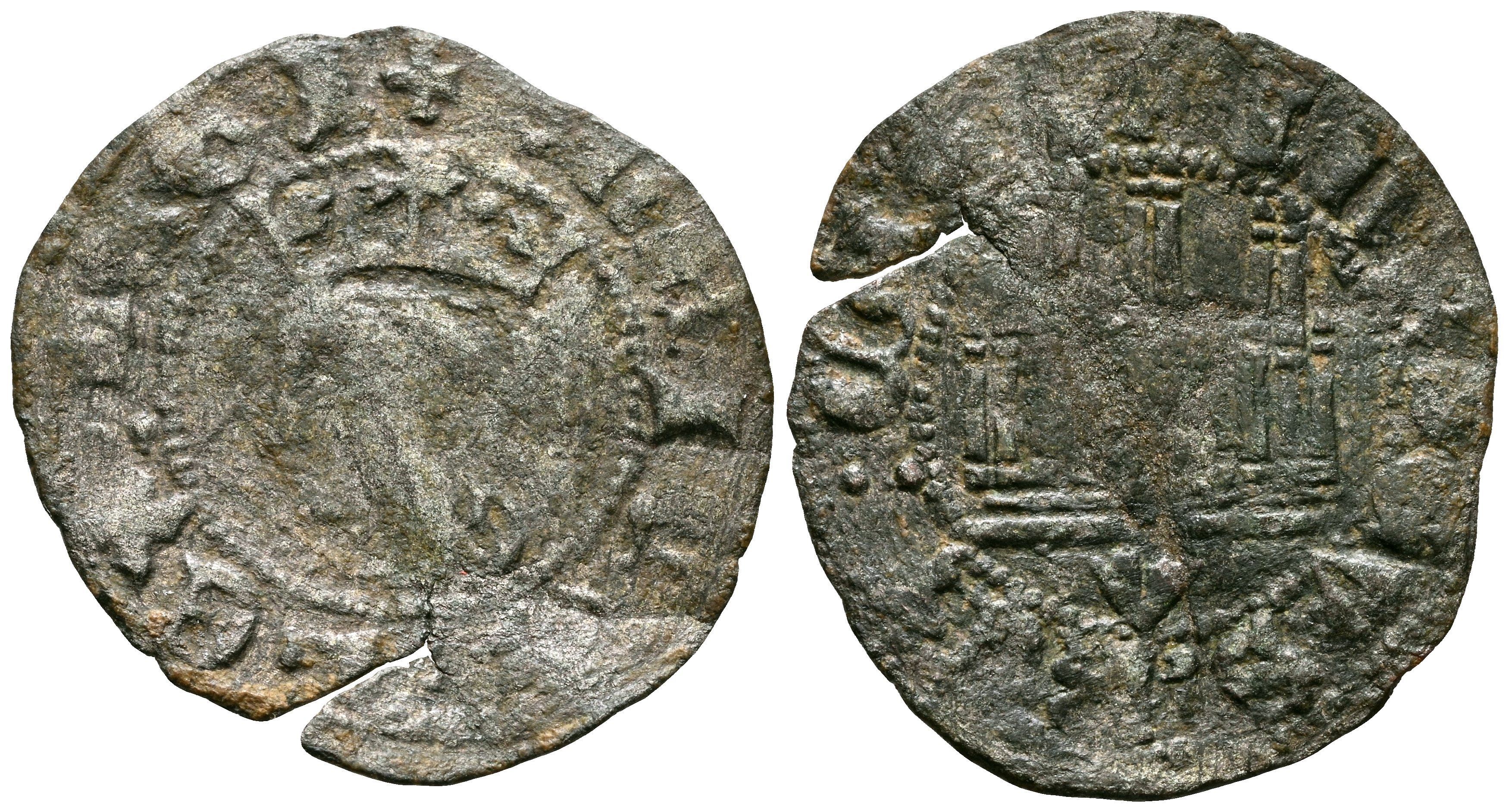 ENRIQUE II (1369-1379). Cornado. (Ve. 0,62g/19mm). Valencia de Alcántara. (Momeca 58.6F.1; FAB-595, como Enrique III y ceca Villalón). Anv: Busto coronado de Enrique II a izquierda dentro de gráfila perlada, alrededor leyenda: ENRICVS REX LEGI. Rev: Castillo, debajo V, todo dentro de gráfila perlada, alrededor leyenda: ENRICVS REX CASTE. MBC-. Grieta. Escasa.