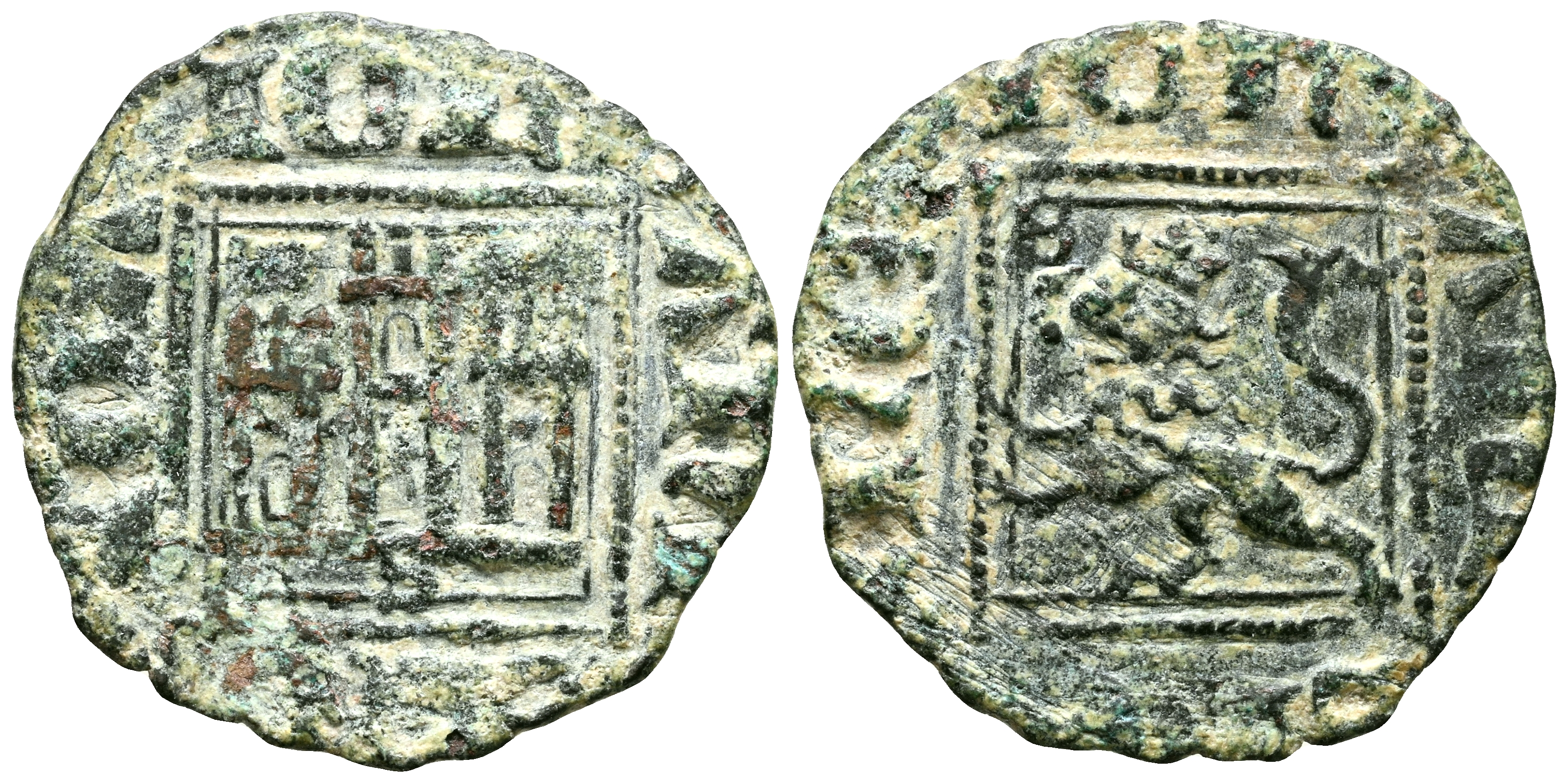 JUAN I (1379-1390). Dinero. (Ve. 0,93g/17mm). Sevilla. (Momeca 64.4B.2; FAB-578.2). Anv: Castillo, debajo S, todo dentro de gráfila cuadrada, alrededor leyenda: IOHANES REX CA. Rev: León rampante a izquierda con S delante de la zarpa, todo dentro de gráfila cuadrada, alrededor leyenda: IOHANES REX LE. MBC. Muy rara.
