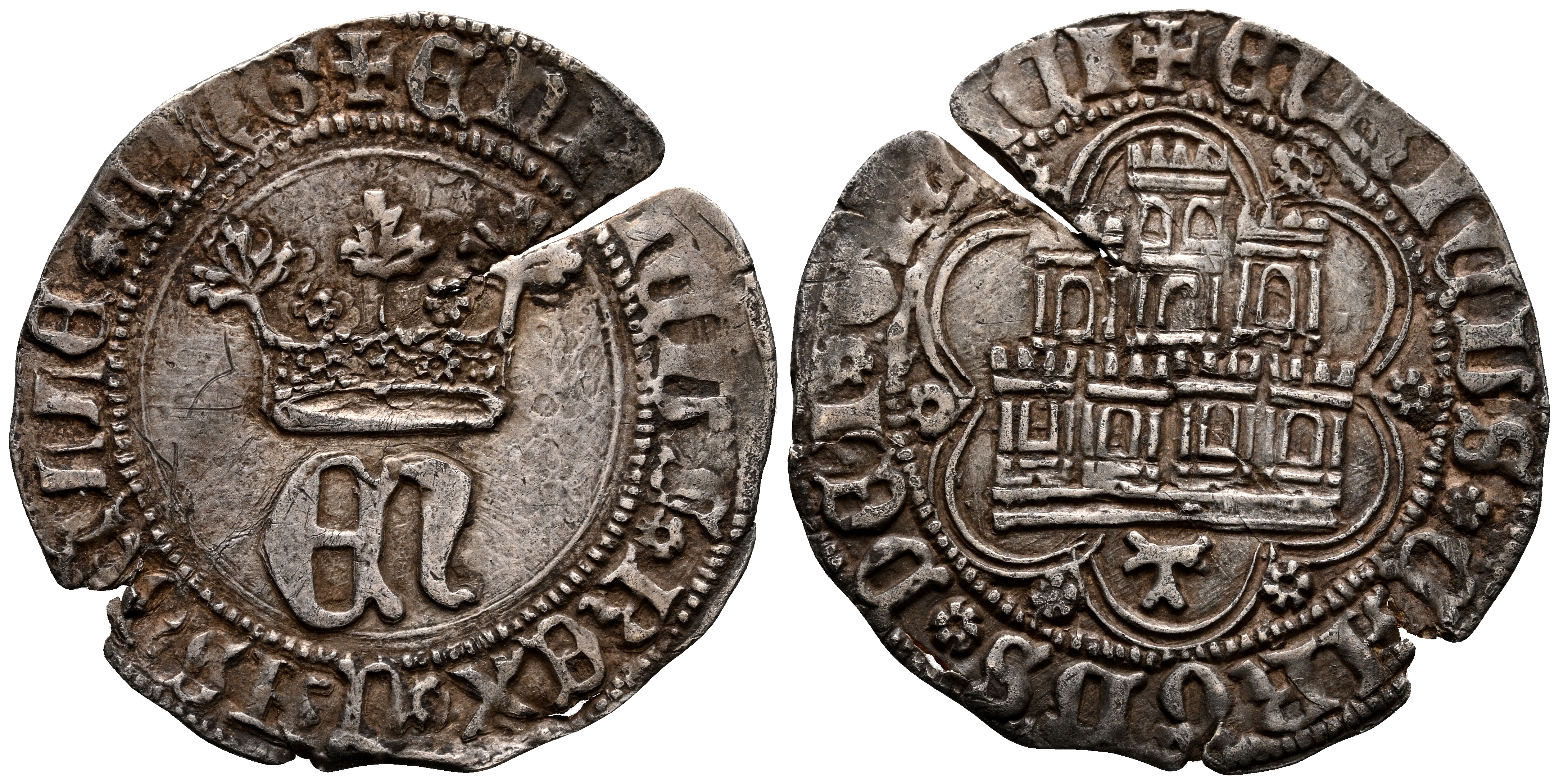 ENRIQUE IV (1454-1474). 1/2 Real. (Ar. 1,57g/22mm). Toledo. (FAB-702.1; Imperatrix E4:10.34; MMM E4:10.32). Anv: Monograma EN coronado, dentro de gráfila de puntos, alrededor leyenda: ENRICVS REX CASTELLE E LEG. Rev: Castillo, debajo: T, dentro de gráfila poliglobular, todo dentro de gráfila de puntos, alrededor leyenda: ENRICVS CARTVS DEI GRACI. MBC. Grieta. Escaso ejemplar.