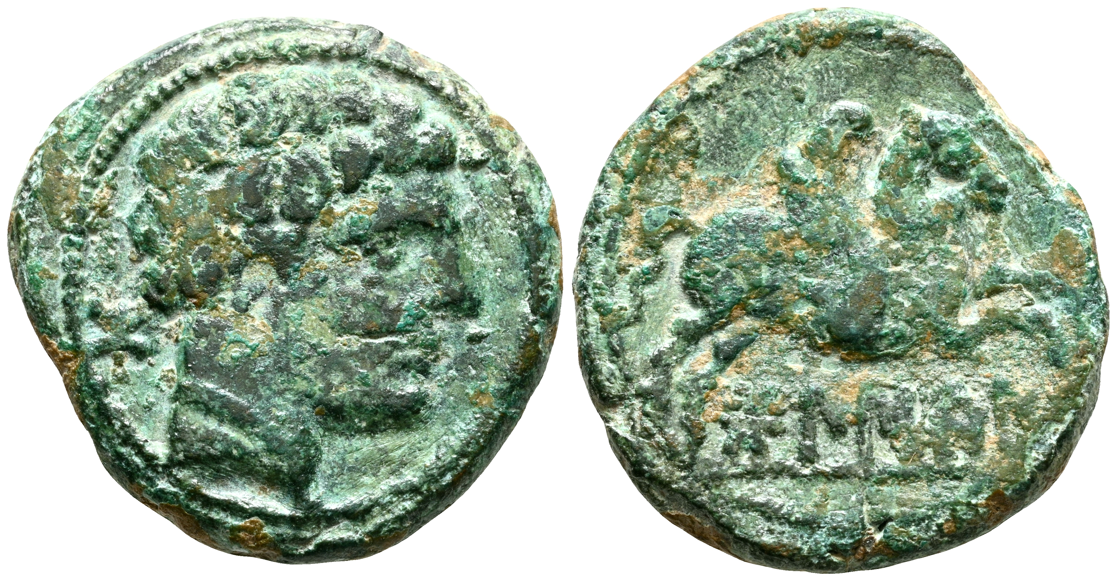 BOLSCAN (Huesca, Aragón). Semis. (Ae. 4,41g/19mm). 180-20 a.C. (FAB-1921). Anv: Cabeza barbada a derecha, detrás letra ibérica Bo. Rev: Pegaso a derecha, debajo leyenda ibérica: BoLSCaN. MBC. Pátina verde.