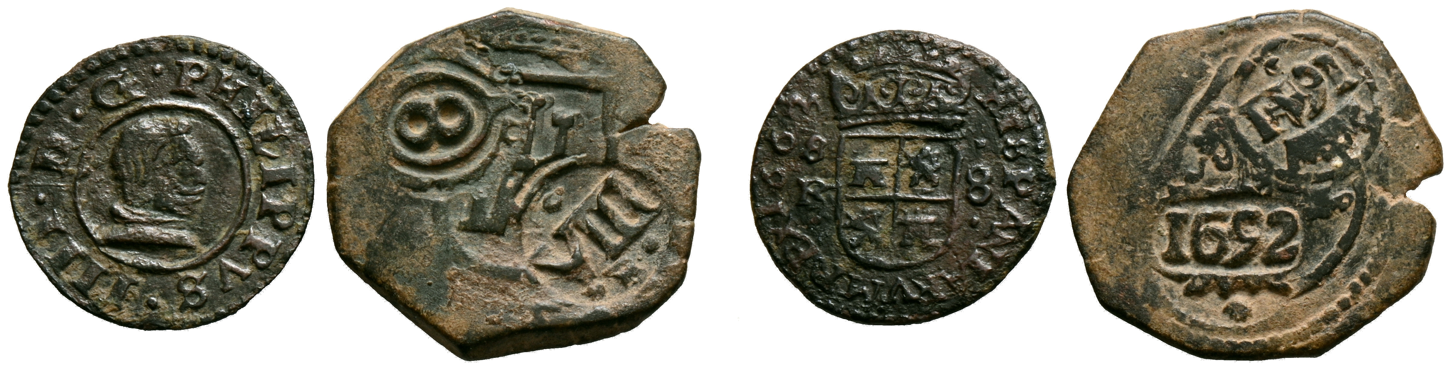 FELIPE IV (1621-1665). Pareja de 8 maravedís acuñadas en Sevilla y ¿Segovia? Una de ellas con resellos (Coruña). Diferentes estados de conservación. A EXAMINAR.