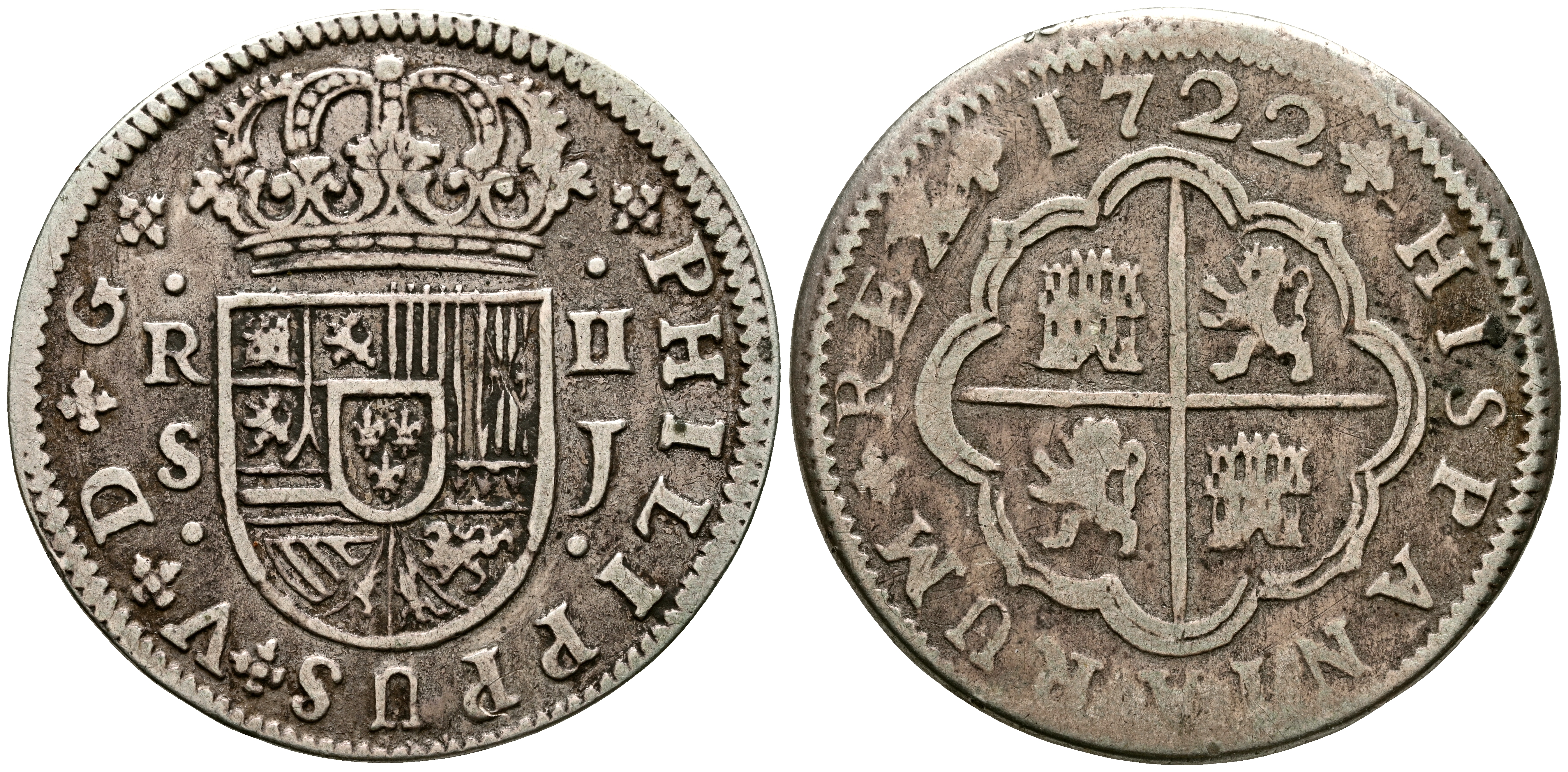 FELIPE V (1700-1746). 2 Reales. (Ar. 4,91g/28mm). 1722. Sevilla J. (Cal-2019-980). MBC-/BC+.