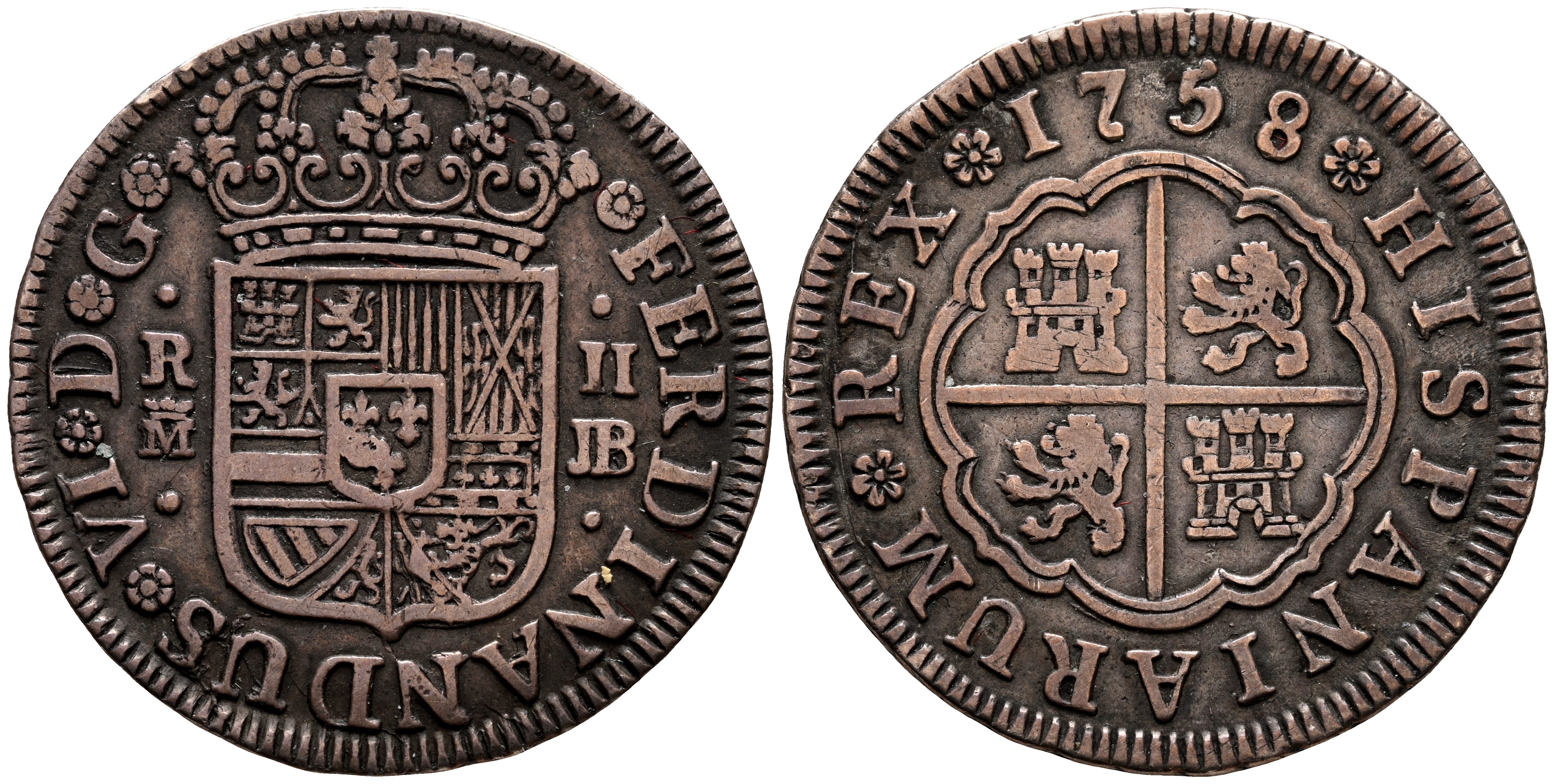 FERNANDO VI (1746-1759). 2 Reales. (Ar. 5,79g/ 27mm). 1758. Madrid JB. (Cal-2019-282). MBC. Tono cobrizo. Escaso ejemplar.