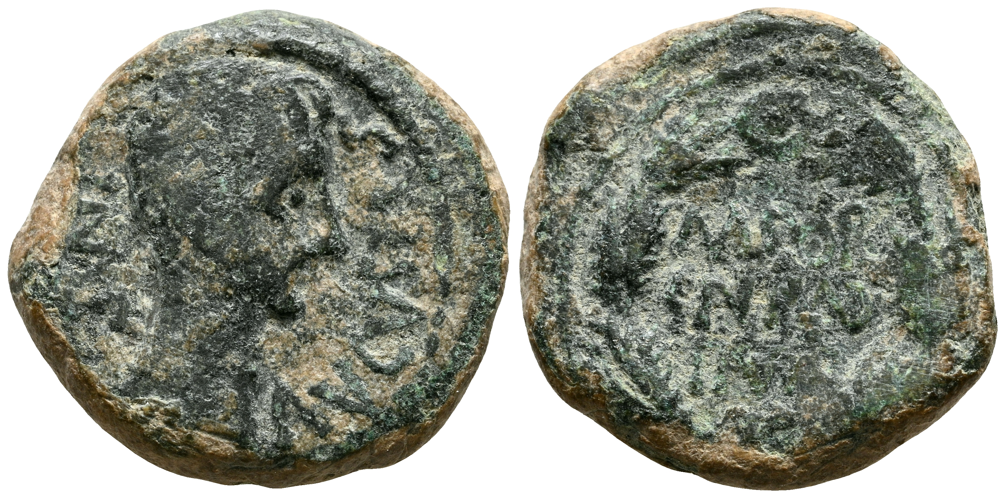 CAESARAUGUSTA (Zaragoza). Cuadrante. (Ae. 3,96g/17mm). 120-30 a. C. (FAB-341). Anv: Cabeza de Augusto a la derecha, alrededor de la leyenda: AVGVSTVS IMP. Rev: Leyenda: M POR CN FAB II VIR, dentro de laurea. MBC-.