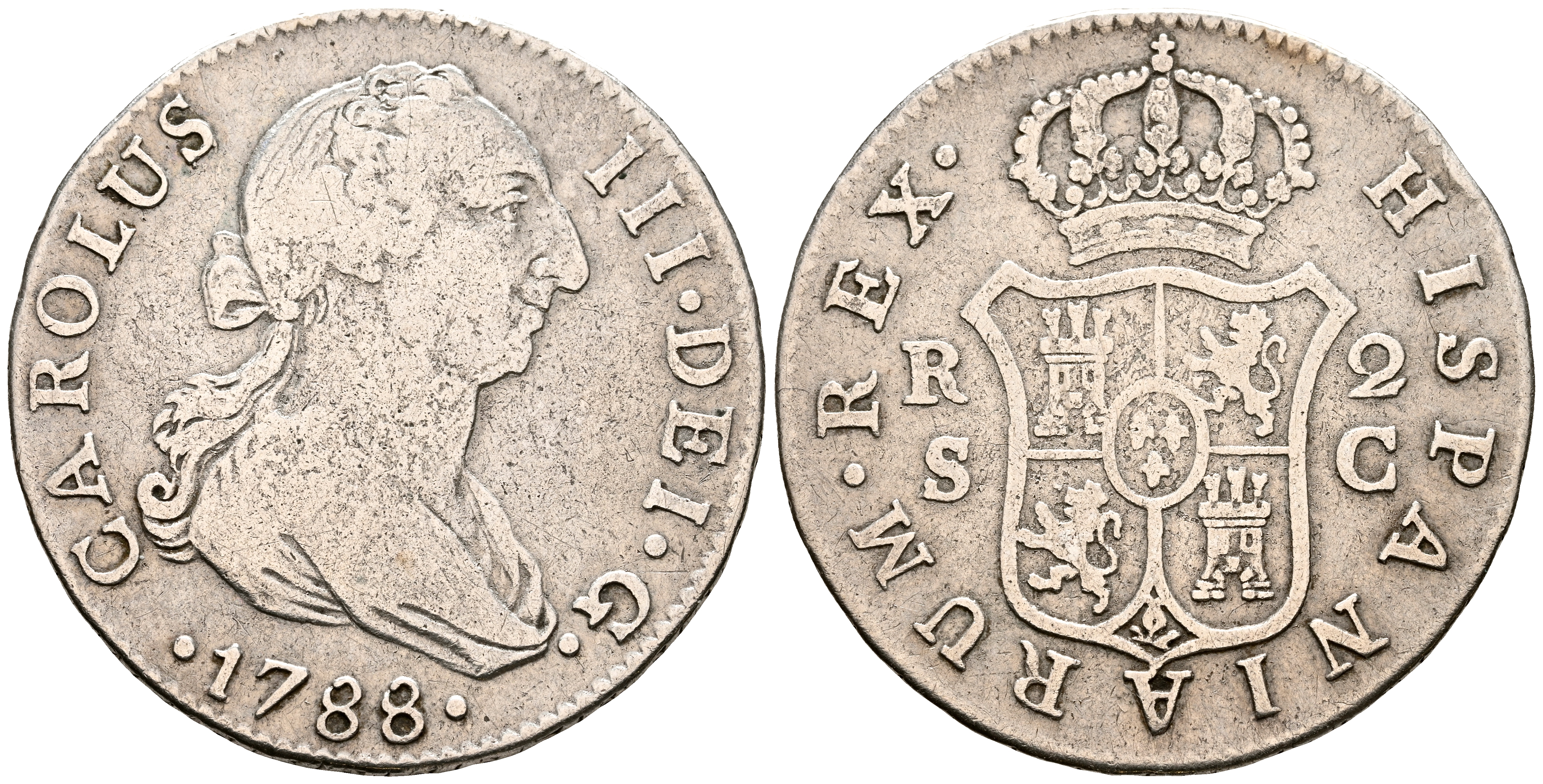 CARLOS III (1759-1788). 2 Reales. (Ar. 5,58g/27mm). 1788. Sevilla C. (Cal-2019-790). BC+. Limpiado.