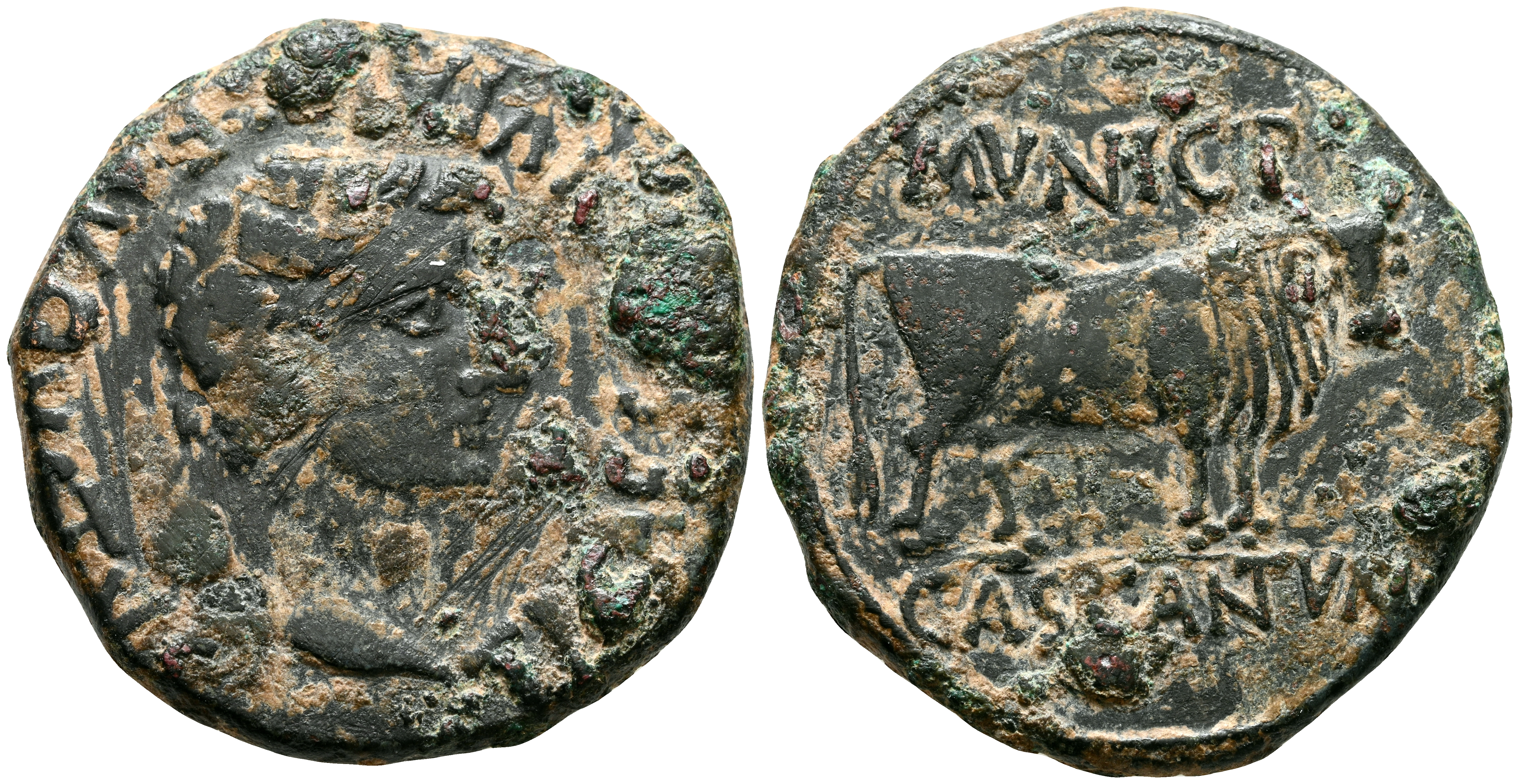 CASCANTUM (Cascante, Navarra). As. (Ae. 14,45g/29mm). 14-36 D.C. (FAB-691). Anv: Cabeza laureada de Tiberio a derecha, alrededor leyenda: TI CAESAR DIVI AVG F AVGVSTVS. Rev: Toro a derecha, encima leyenda: MVNICIP, debajo: CASCANTVM. MBC-/MBC. Concreciones.