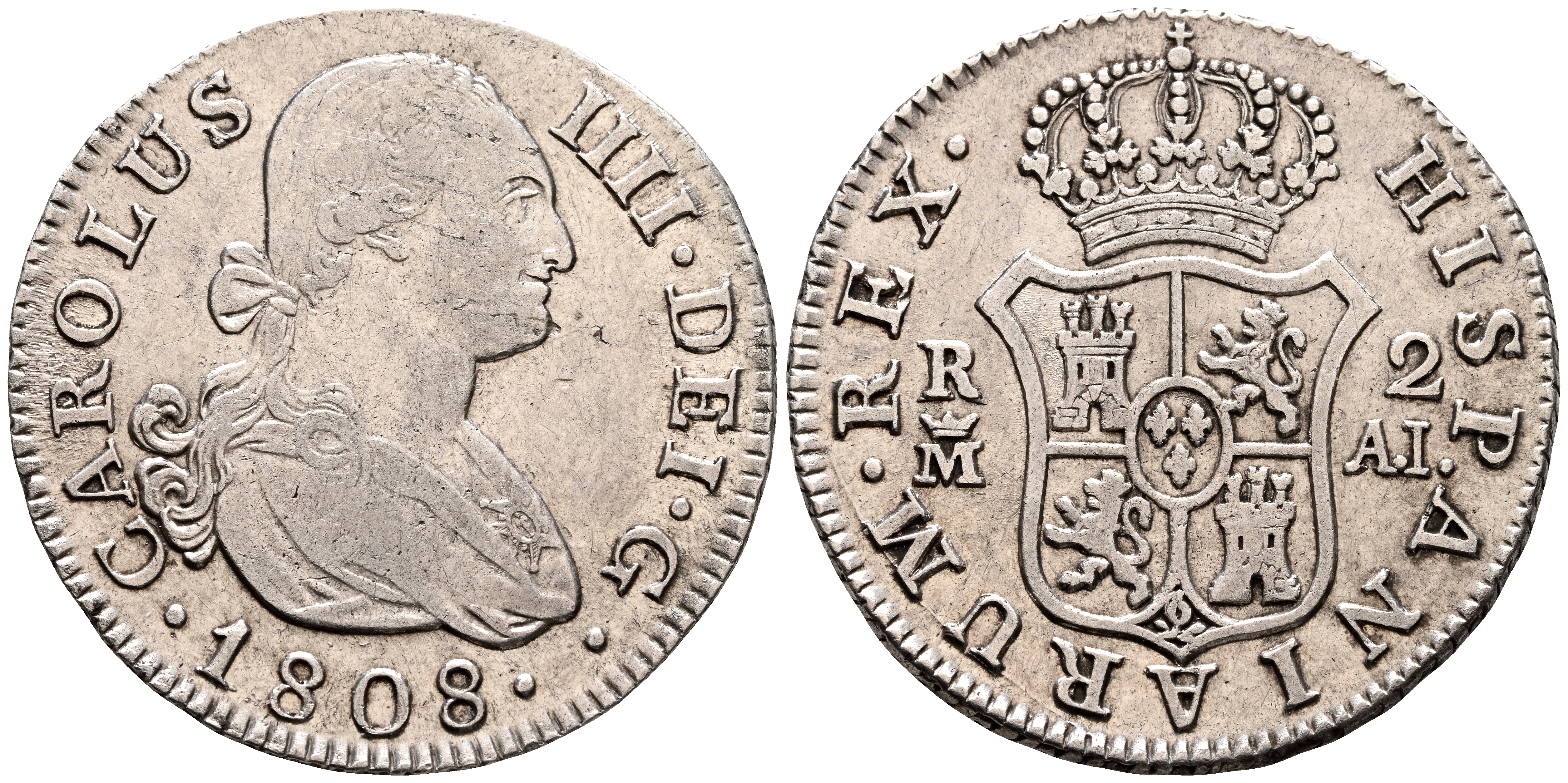 CARLOS IV (1788-1808). 2 Reales. (Ar. 5,97g/26mm). 1808. Madrid MF. (Cal-2019-619). MBC+/MBC. Ligeros restos de brillo original.