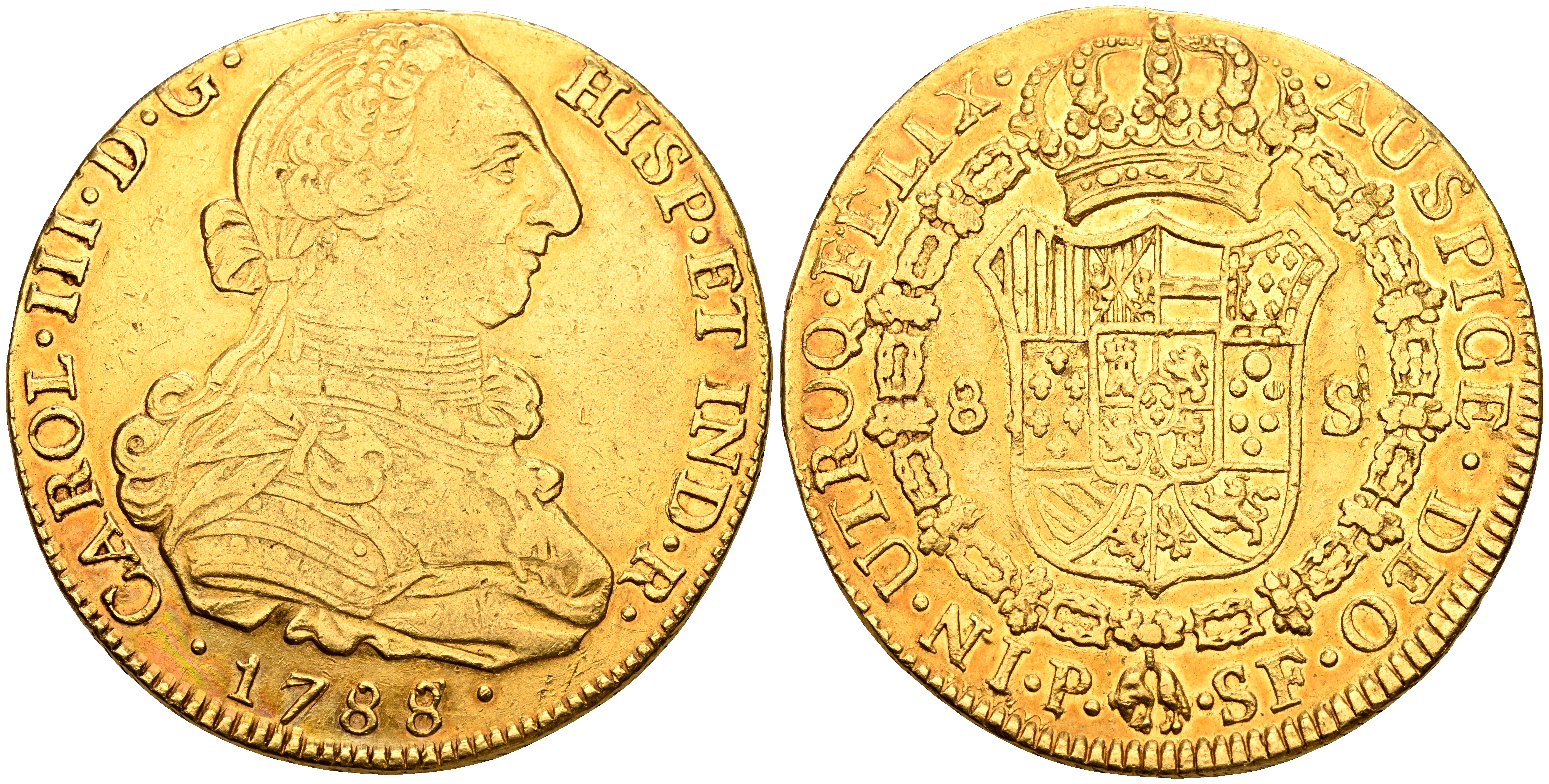 CARLOS III (1759-1788). 8 Escudos (Au. 26,86g/36mm). 1788/7. Popayán FM. (Cal-2019-2023). MBC. Restos de brillo original.