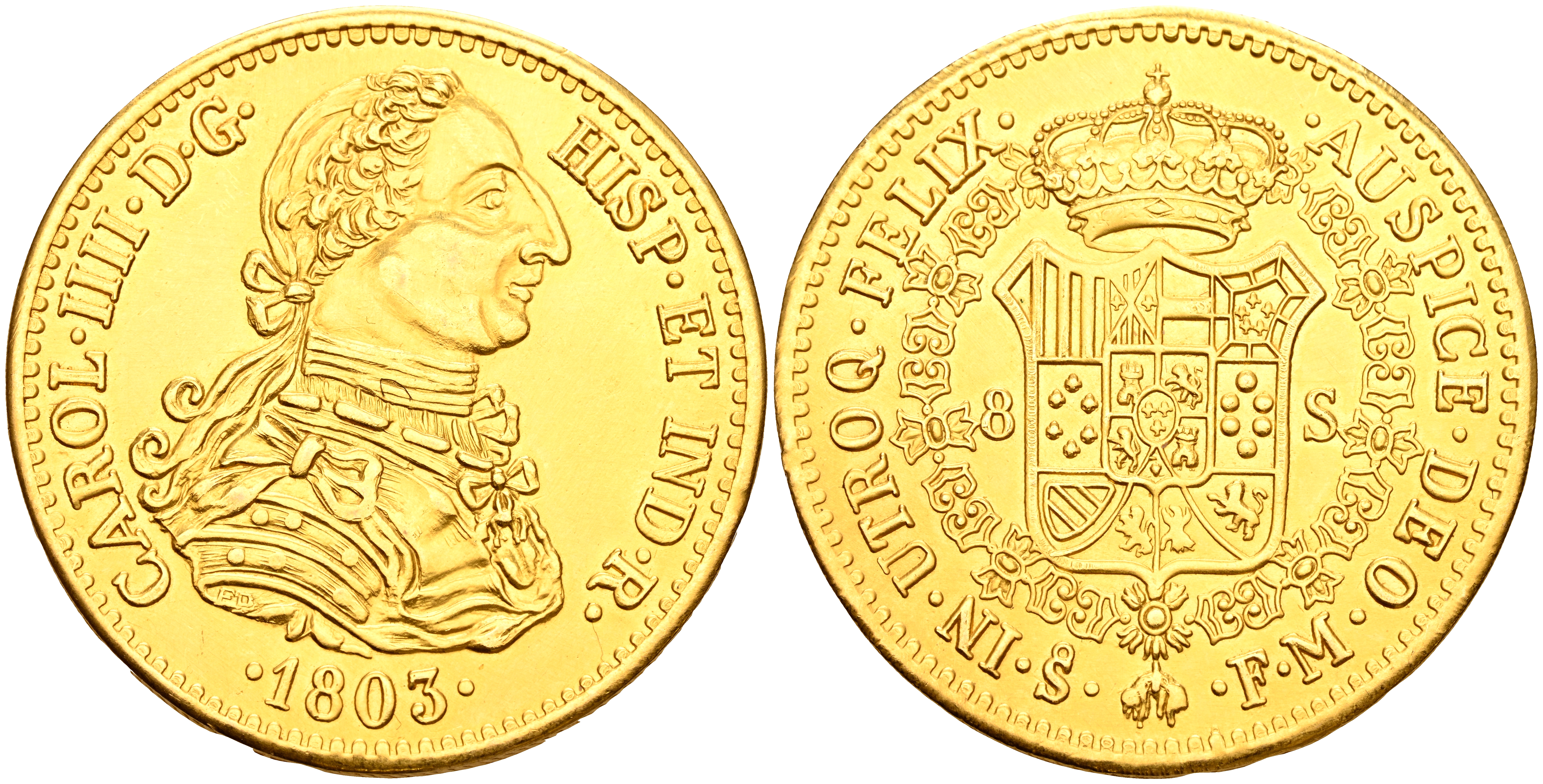 CARLOS IV (1788-1808). 8 Escudos. (Au. 26,85g/37mm). 1803. Santiago FM. Réplica de joyería. Oro de 0,700 milésimas. SC.