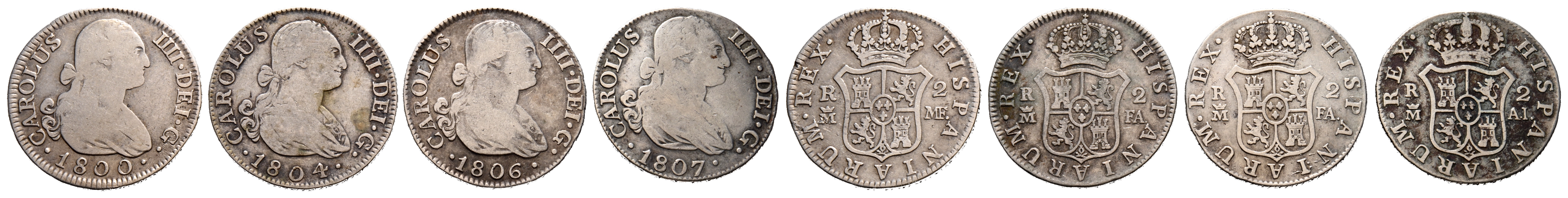CARLOS IV (1788-1808). Conjunto de 5 monedas de 2 Reales acuñadas en Madrid. Diferentes fechas (1797, 1800, 1804, 1806 y 1807) así como estados de conservación. A EXAMINAR.