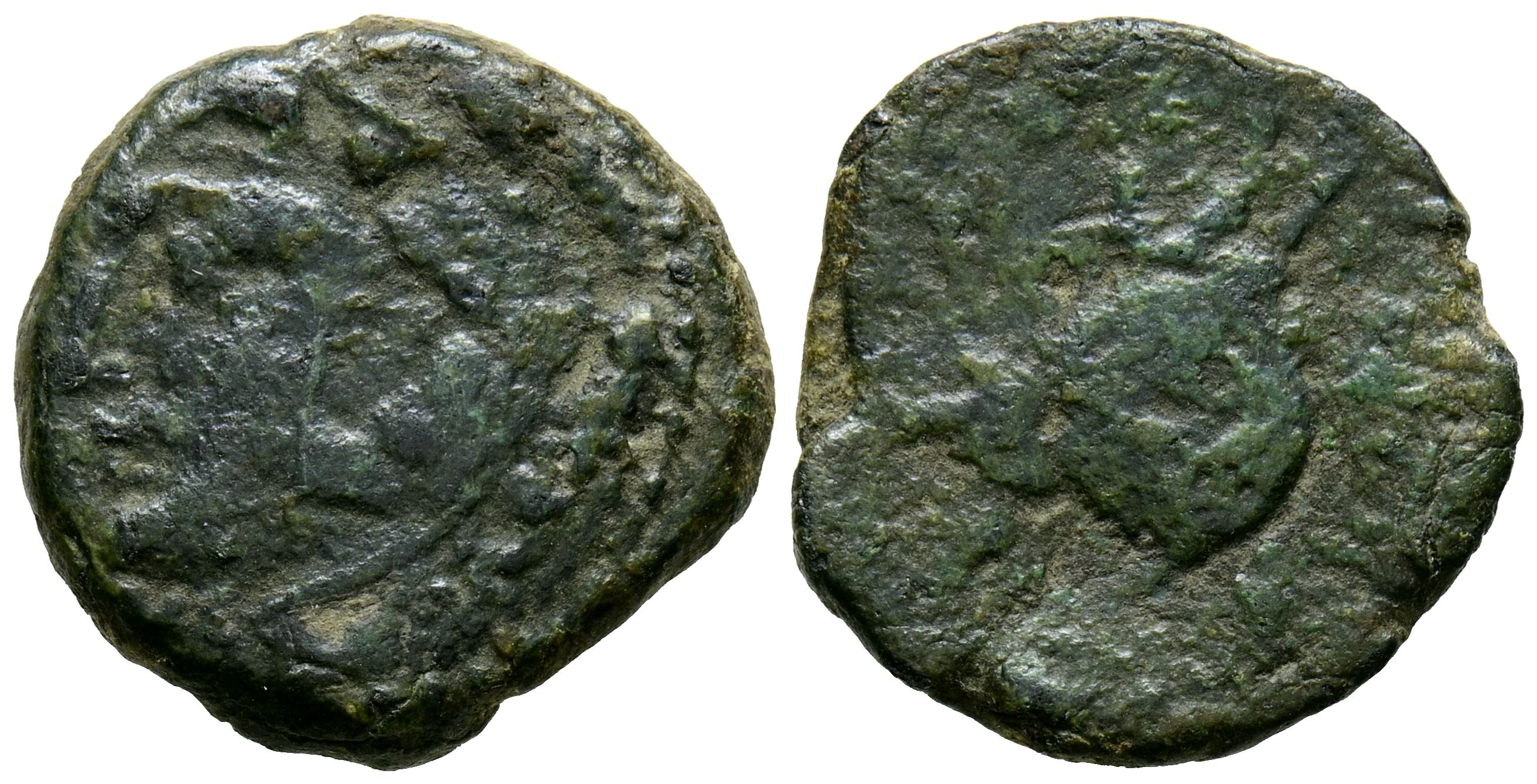 CARISA (Bornos, Cádiz). Semis. (Ae. 4,19g/18mm). 50 a.C. (FAB-446). Anv: Cabeza de Hércules con piel de león a izquierda. Rev: Jinete con lanza y escudo a izquierda, debajo leyenda: CARISSA. BC.