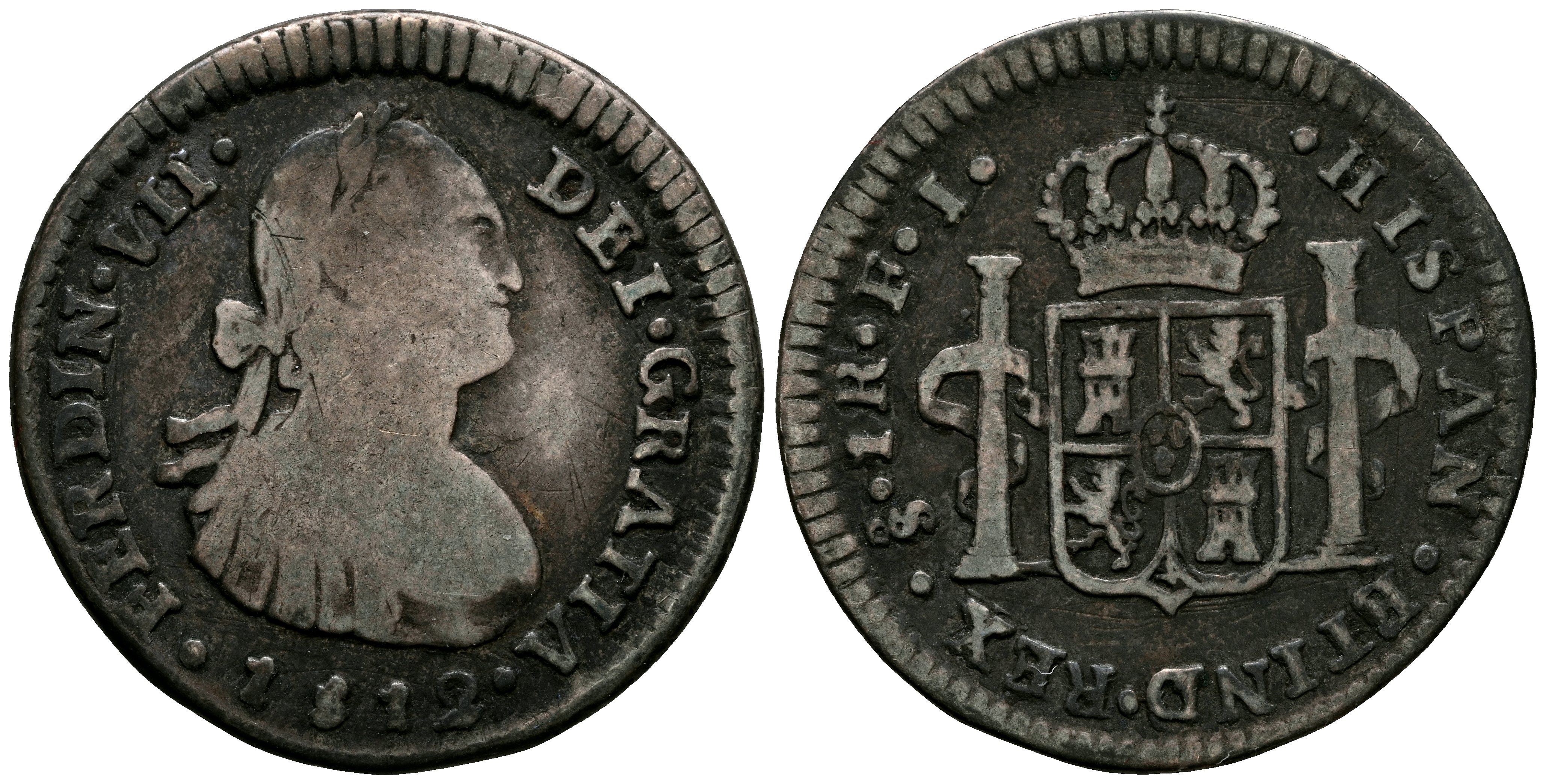 FERNANDO VII (1808-1833). 1 Real. (Ar. 3,14g/21mm). 1812/1. Santiago FJ. (Cal-2019-670). Busto de Carlos IV. BC+. Bonita pátina oscura. Escasa.