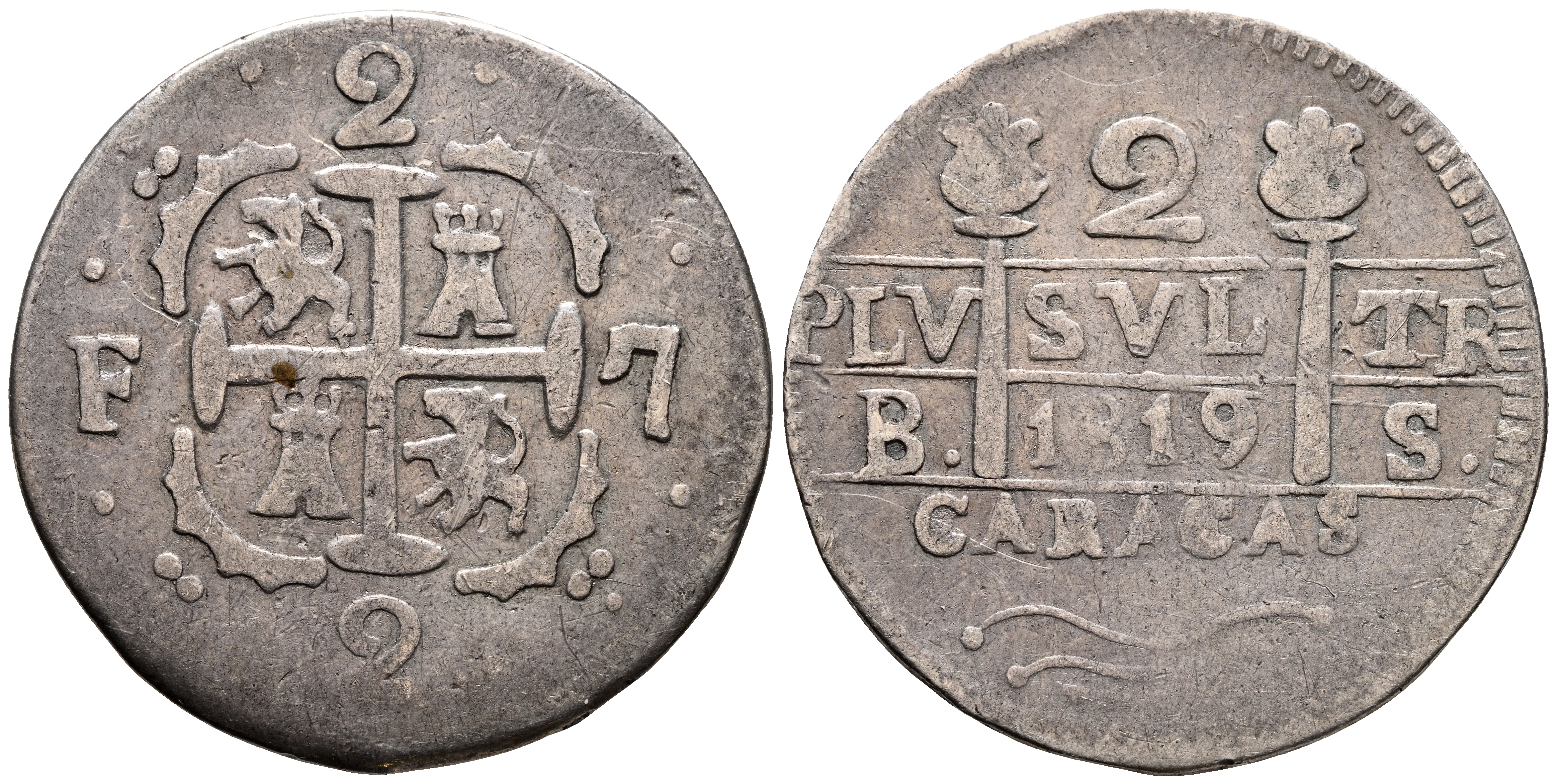 FERNANDO VII (1808-1833). 2 Reales. (Ar. 4,35g/24mm). 1819. Caracas BS. (Cal-2019-737). Leones y castillos. Acuñación realista. MBC-.