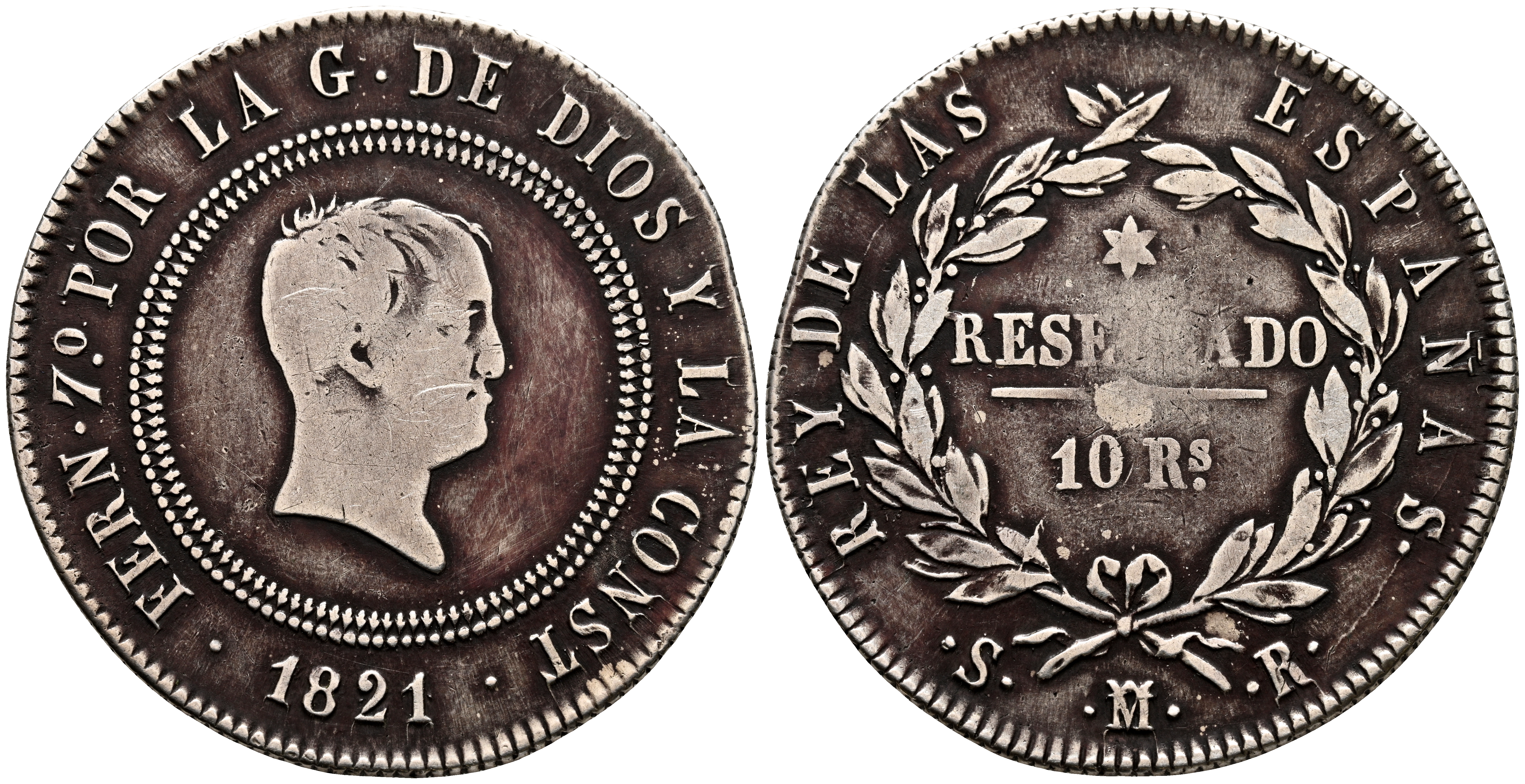 FERNANDO VII (1808-1833). 10 Reales. (Ar. 12,51g/33mm). 1821. Madrid SR. (Cal-2019-1088). MBC-.