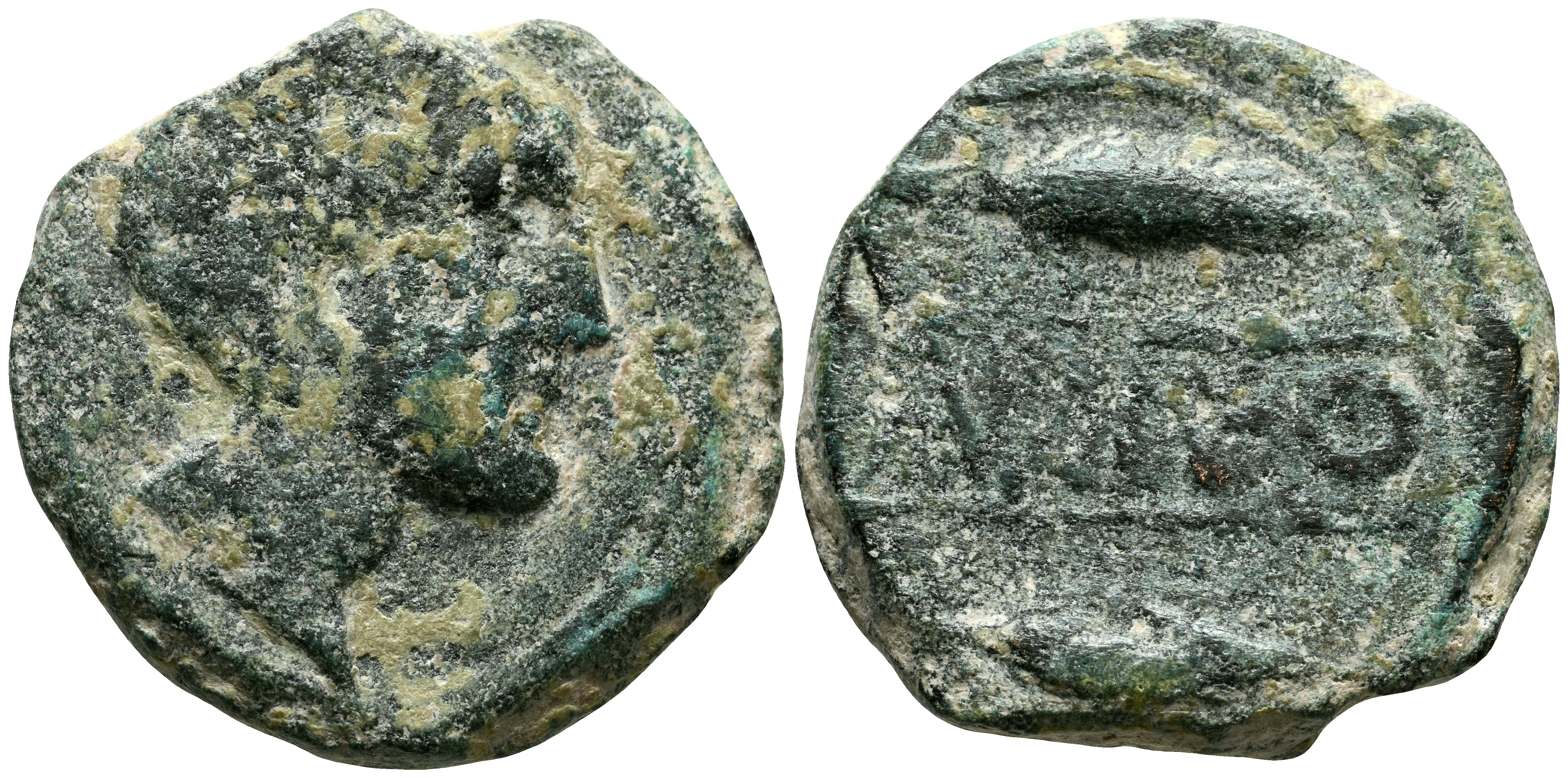 CARMO (Carmona, Sevilla). Semis. (Ae. 10,44g/24mm). 80 a.C. (FAB-459). Anv: Cabeza masculina a derecha. Rev: Dos espigas a derecha, entre ellas leyenda: CARMO. MBC-.
