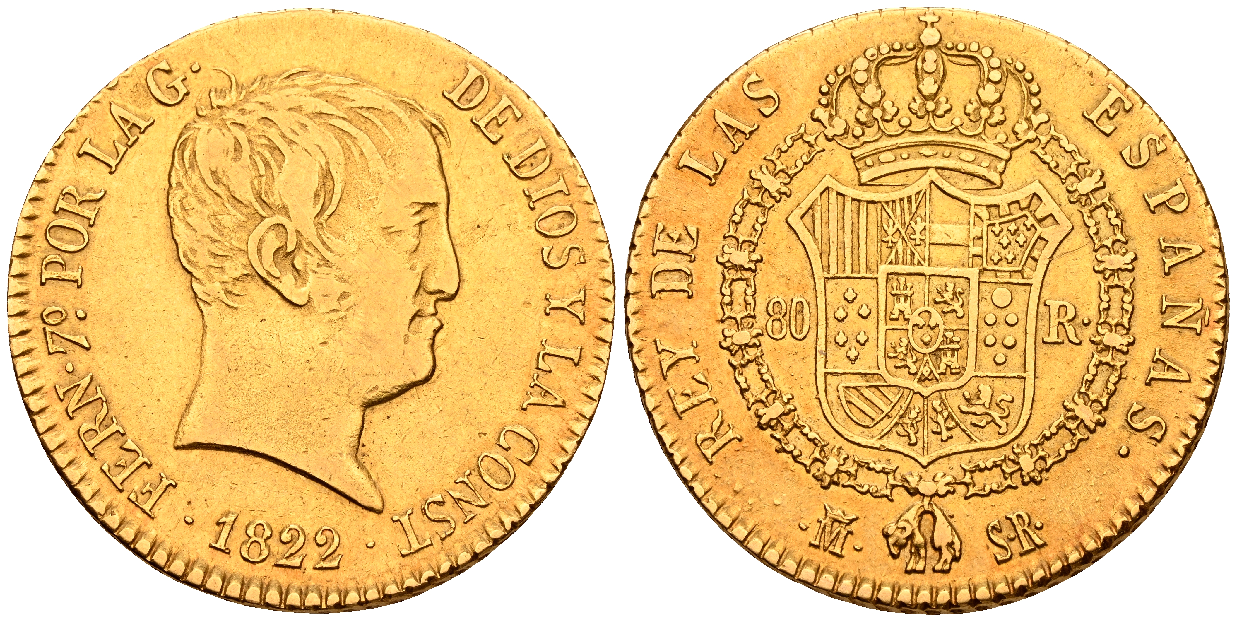 FERNANDO VII (1808-1833). 80 Reales. (Au. 6,74g/23mm). 1822. Madrid SR. (Cal-2019-1641). MBC+.