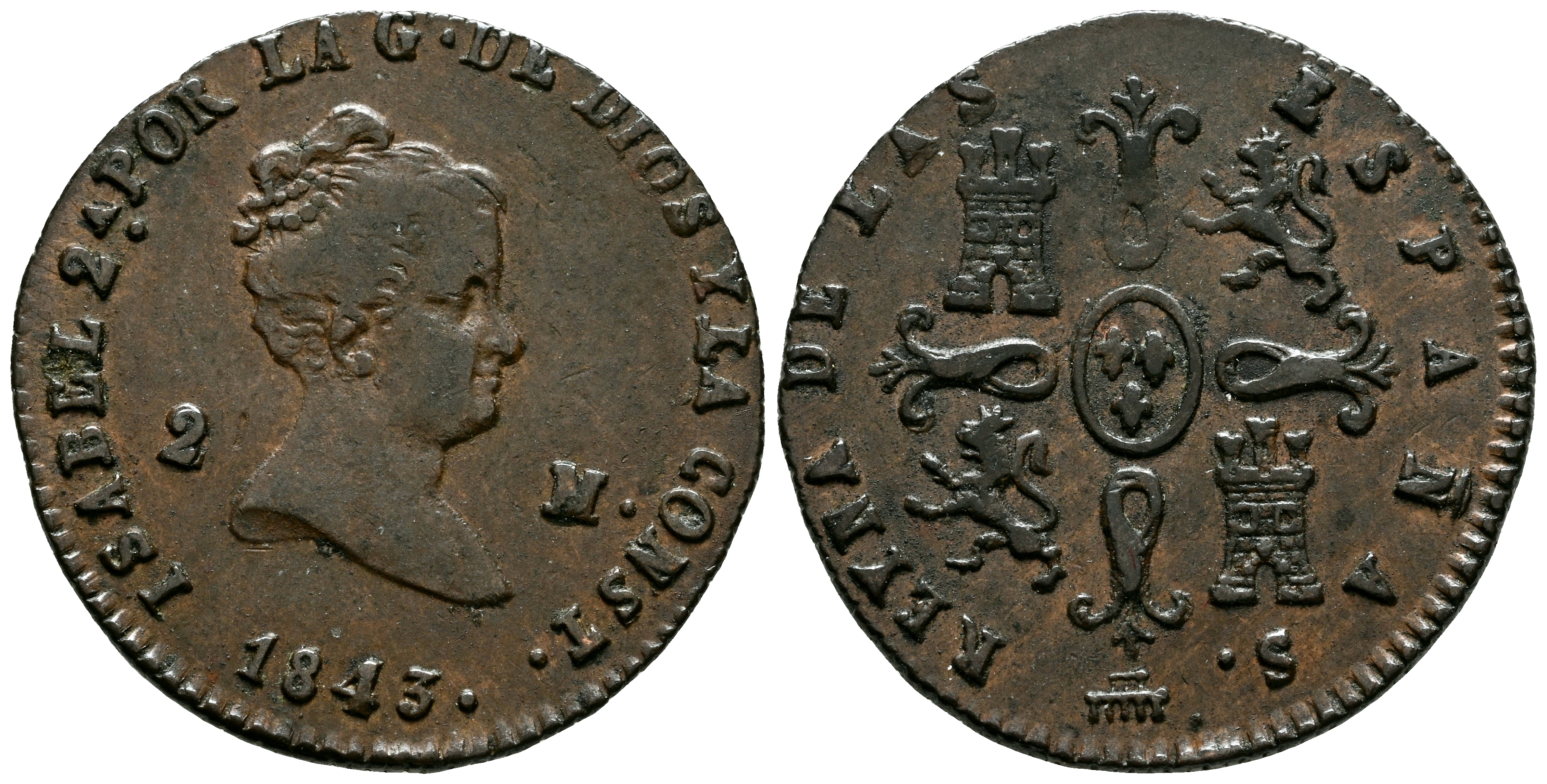 ISABEL II (1833-1868). 2 Maravedís. (Ae. 2,23g/18mm). 1843. Segovia. (Cal-2019-55). MBC+.