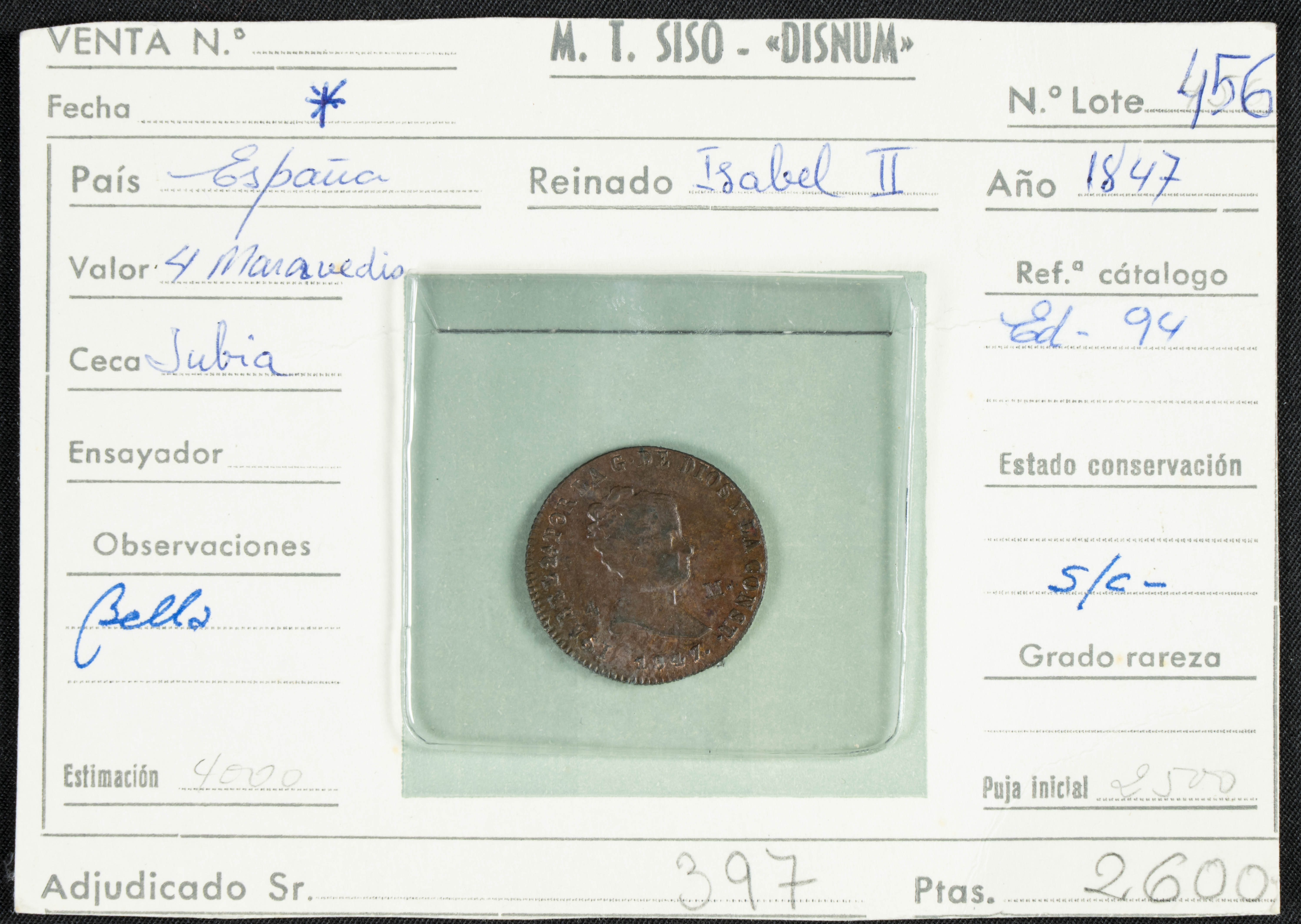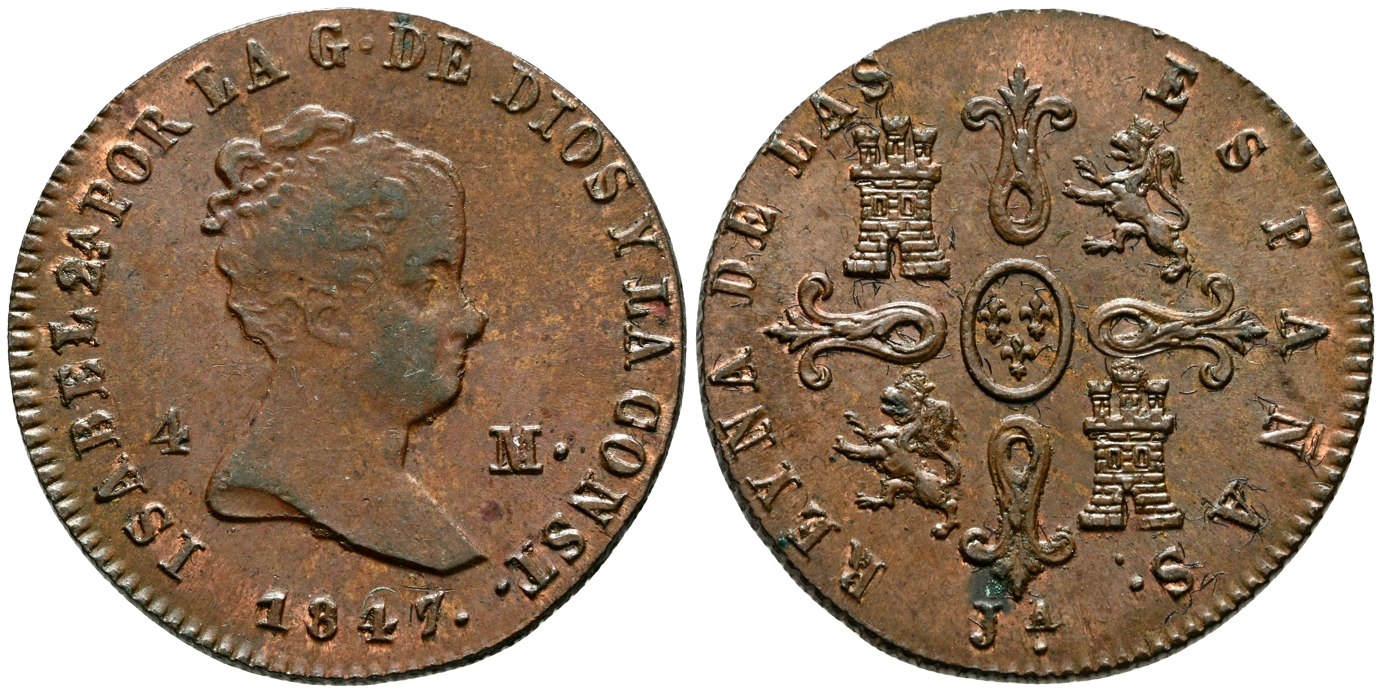 ISABEL II (1833-1868). 4 Maravedís. (Ae. 5,25g/24mm). 1847. Jubia. (Cal-2019-73). SC-. Pequeño punto de óxido en reverso. Incluye ficha original de M. T. Sisó Disnum.