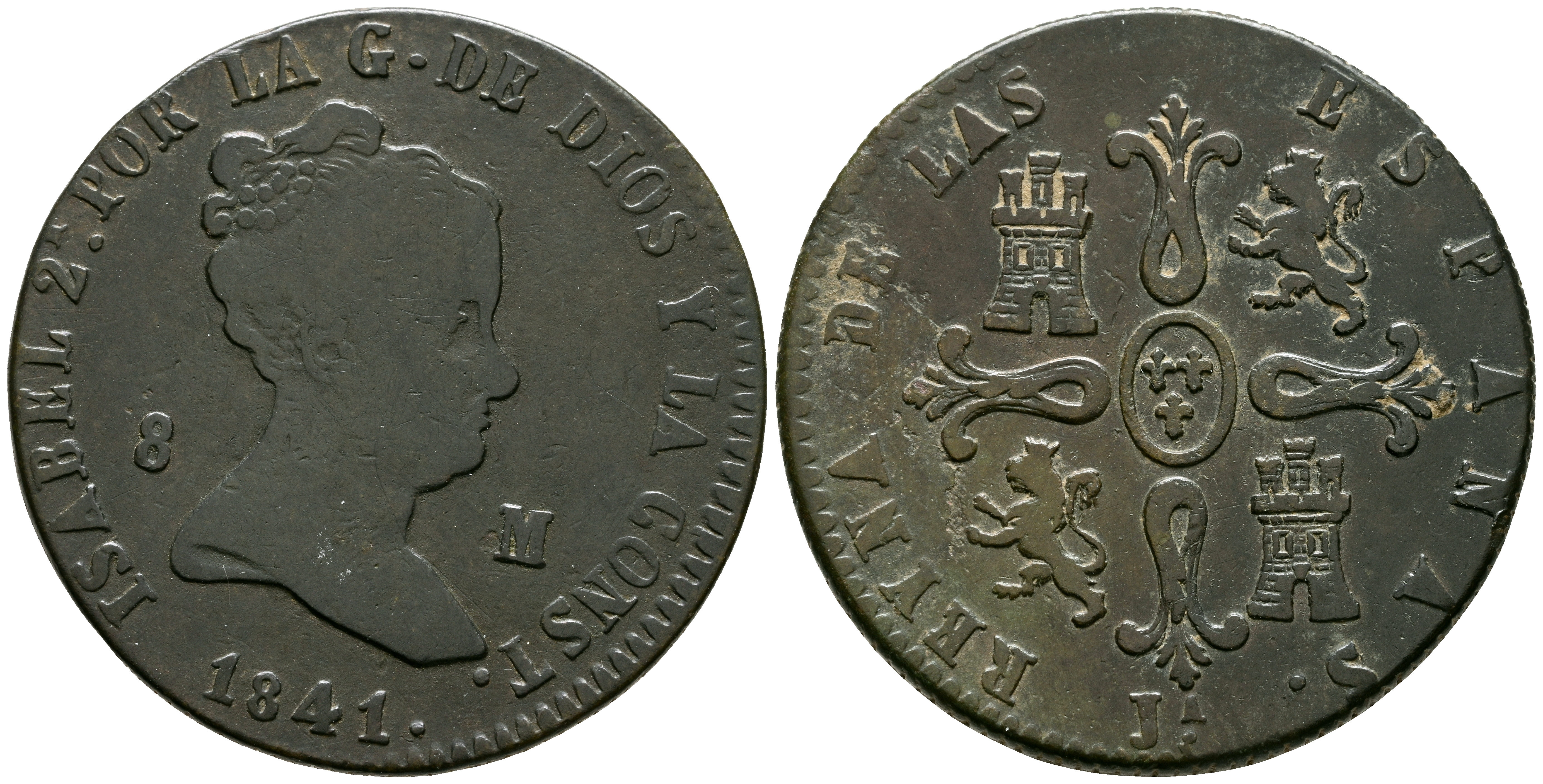 ISABEL II (1833-1868). 8 Maravedís (Ae. 10,15g/28mm). 1841. Jubia. (Cal-2019-108). MBC-/MBC.