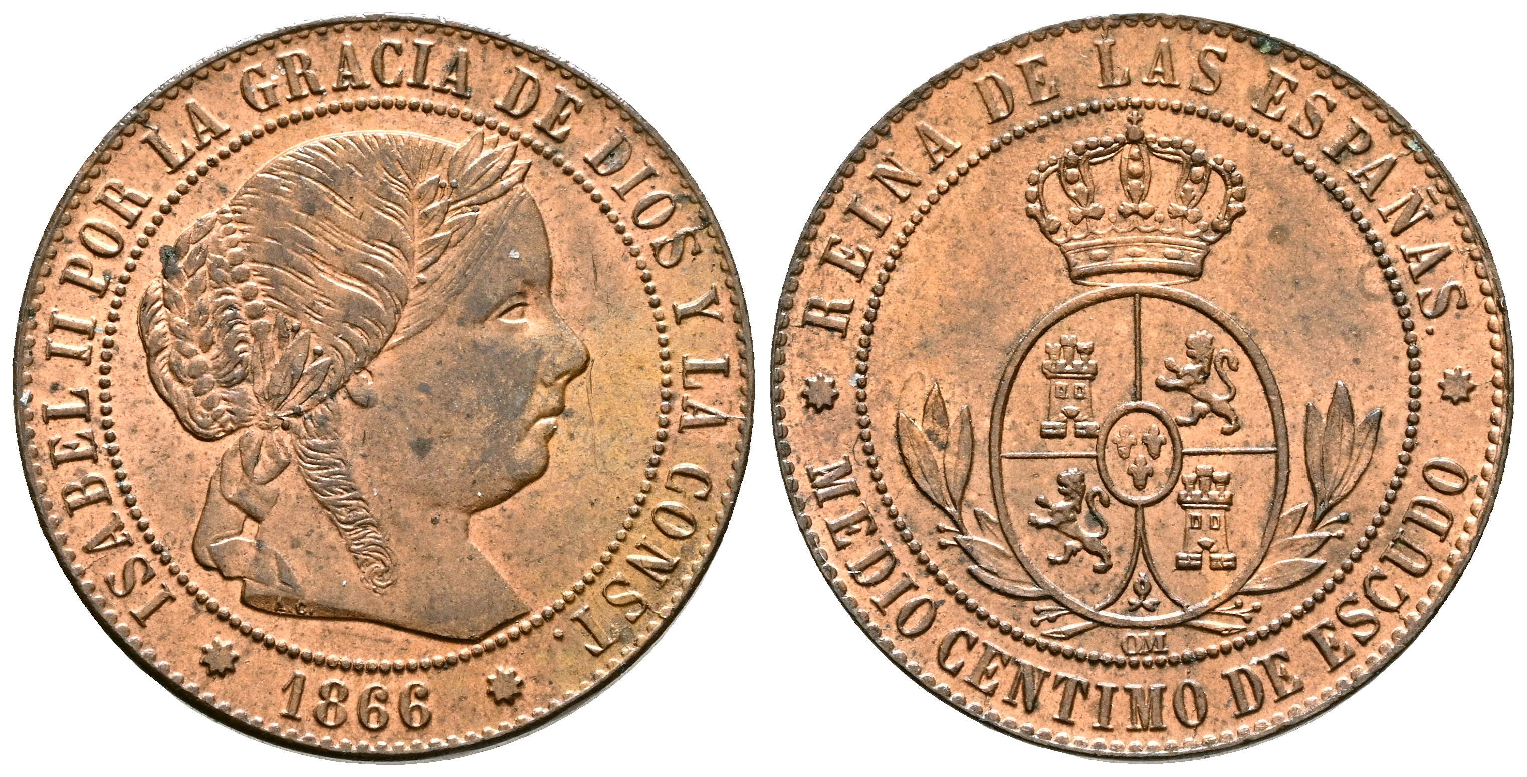 ISABEL II (1833-1868). 1/2 Céntimos de Escudo. (Ae. 1,21g/16mm). 1866. Barcelona OM. (Cal-2019-199). EBC.