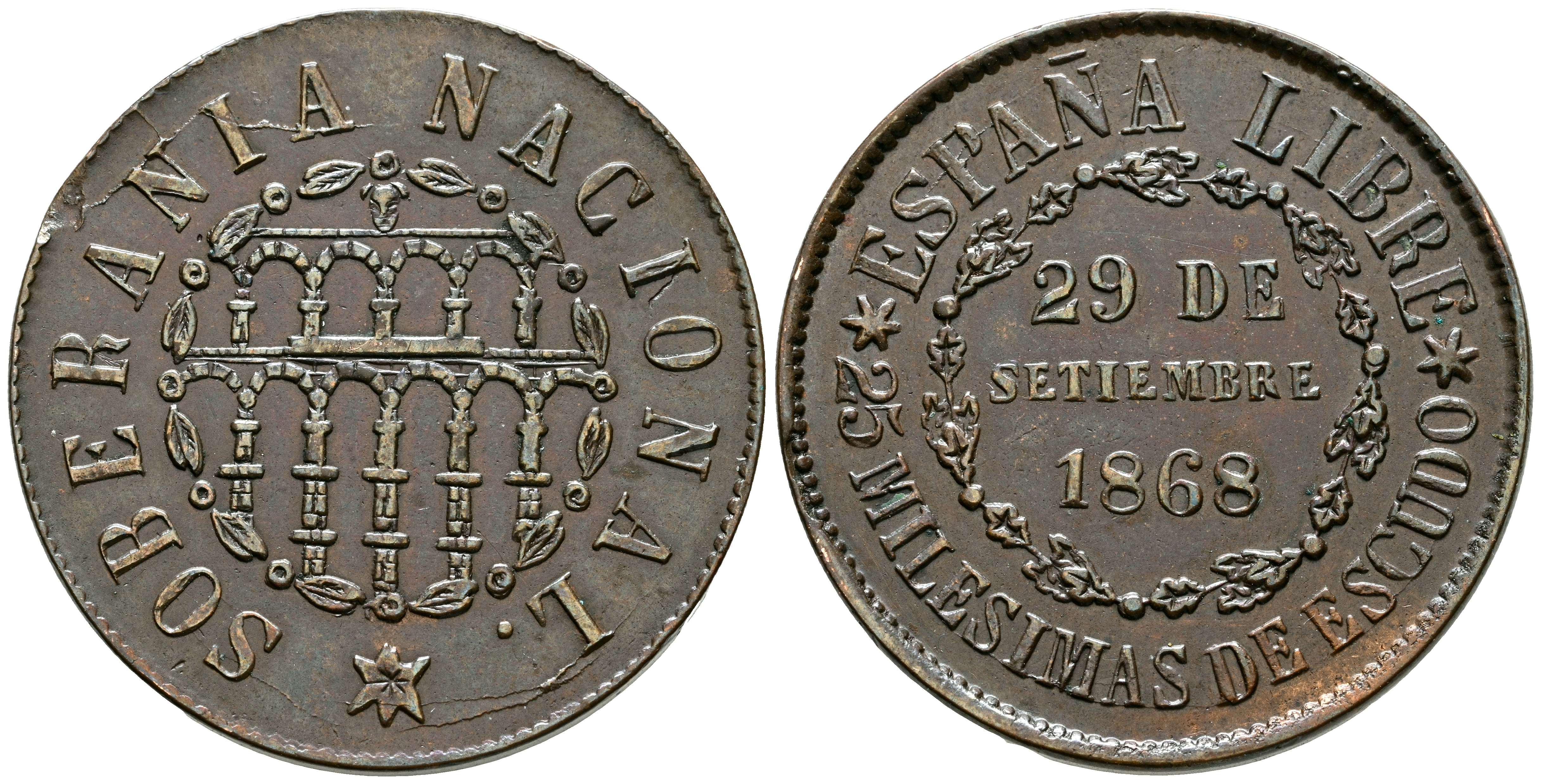 GOBIERNO PROVISIONAL (1868-1871). 25 Milésimas de Escudo. (Ae. 6,12g/25mm). 1868. Segovia. (Cal-2019-10). EBC-. Golpe en anverso.