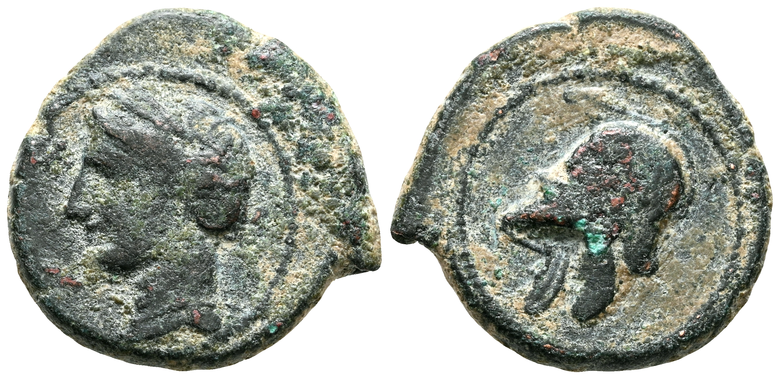 CARTAGONOVA (Cartagena, Murcia). 1/4 Calco. (Ae. 1,53g/14mm). 220-215 a.C. (FAB-521). Anv: Cabeza de Tanit a izquierda. Rev: Casco a izquierda. MBC.