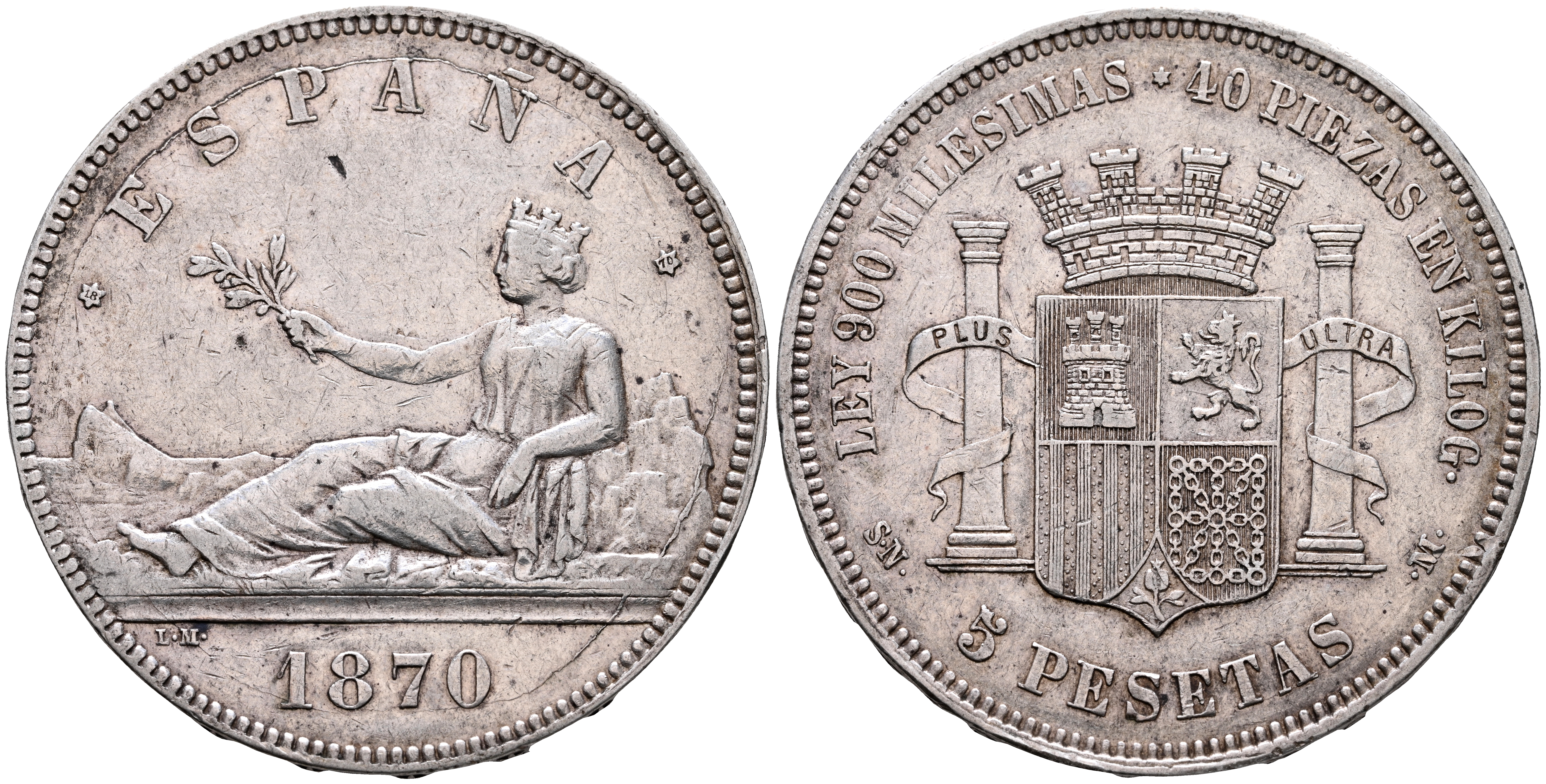 GOBIERNO PROVISIONAL (1868-1871). 5 Pesetas. (Ar. 24,75g/37mm). 1870 *18-70. Madrid SNM. (Cal-2019-39). MBC.