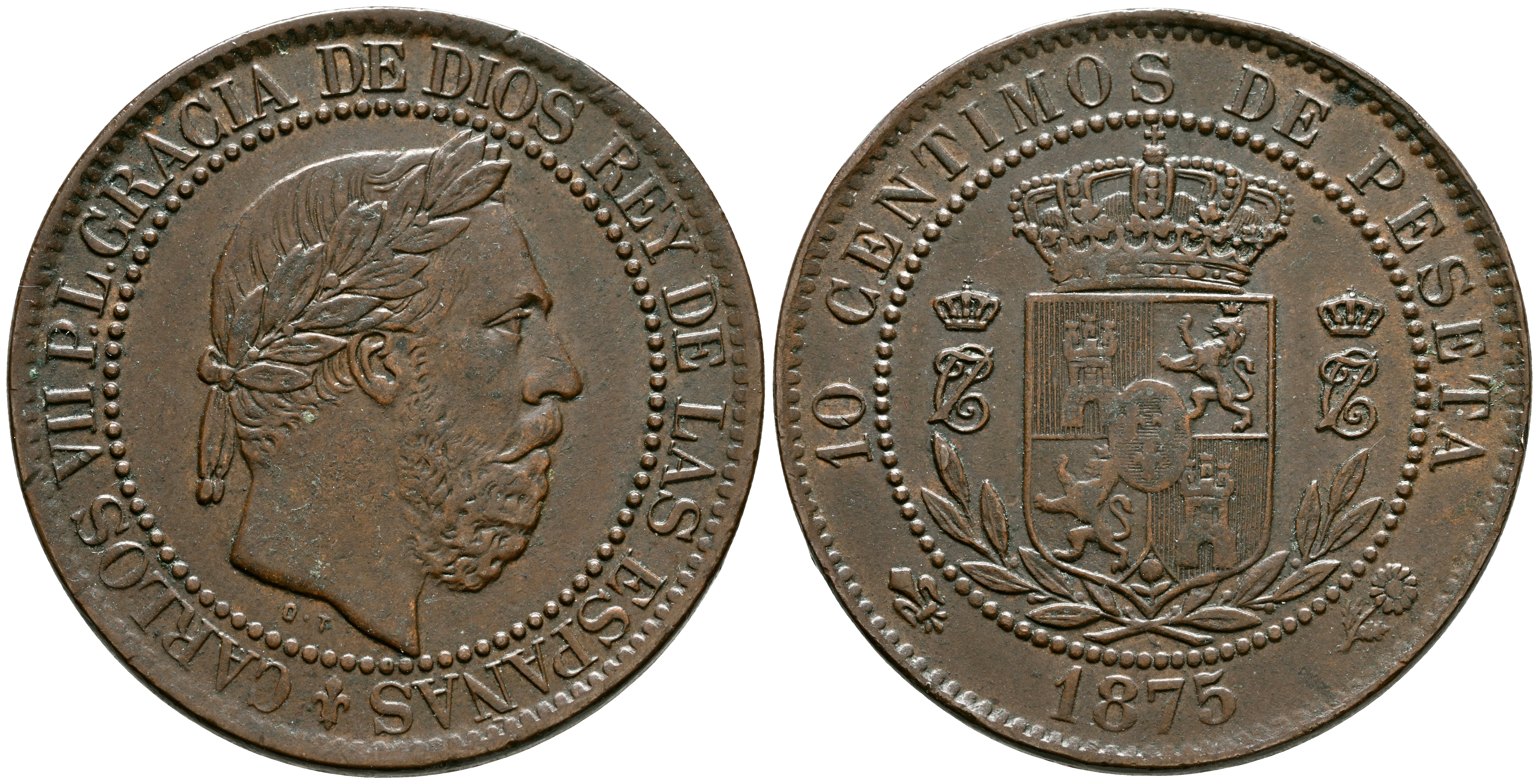 CARLOS VII (1868-1909). 10 Céntimos. (Ae. 10,18g/30mm). 1875. Oñate. (Cal-2019-5). Anverso y reverso coincidentes. MBC+.