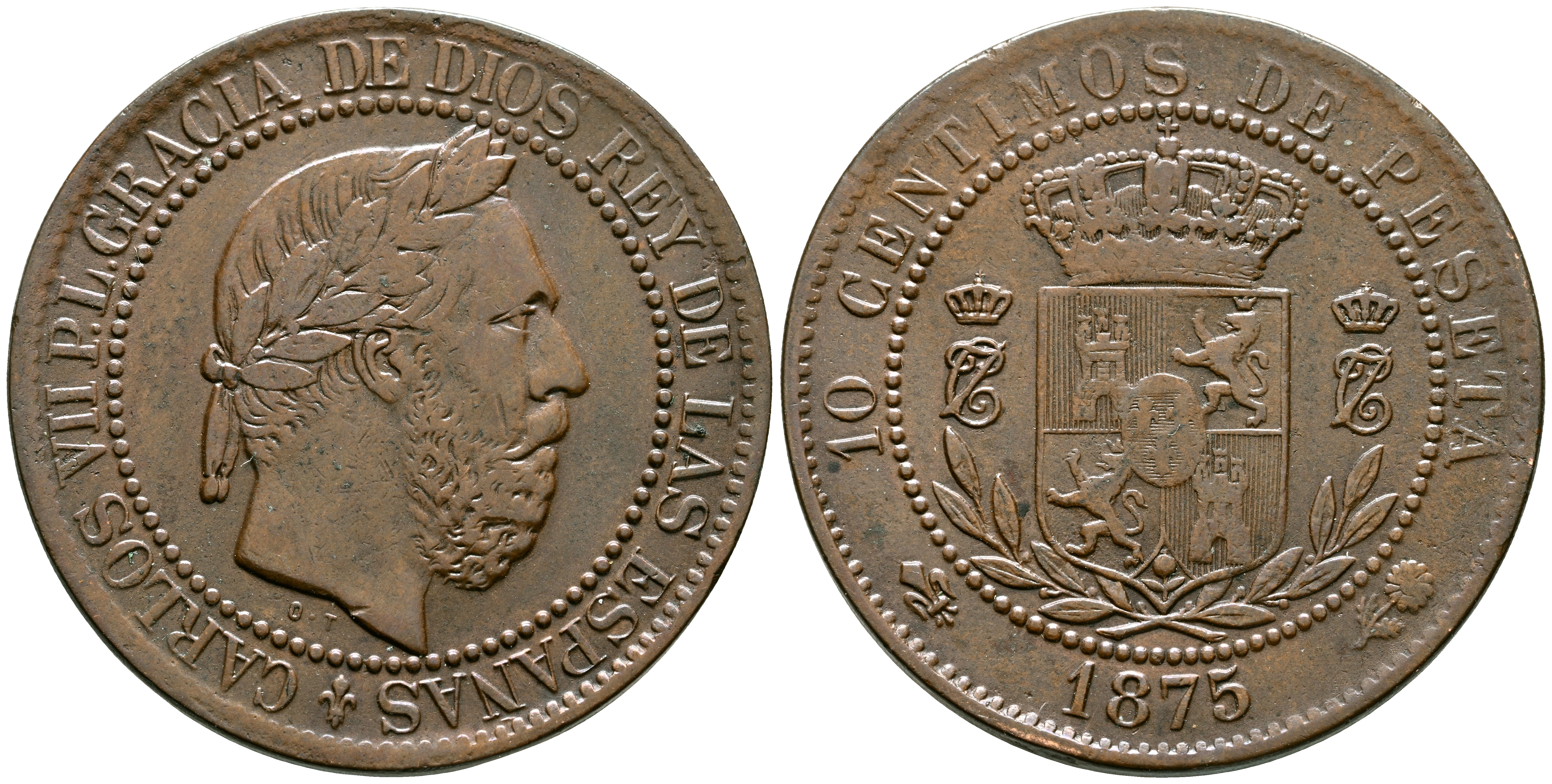 CARLOS VII (1868-1909). 10 Céntimos. (Ae. 10,02g/30mm). 1875. Oñate. (Cal-2019-5). Anverso y reverso coincidentes. MBC+.